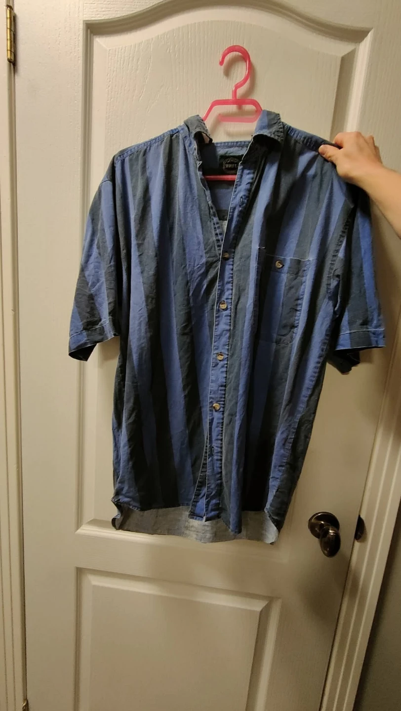 Here's a Thrust short-sleeved button-up shirt! It features a blue and grey striped pattern and a pocket on the left side. Perfect for a casual, relaxed look.