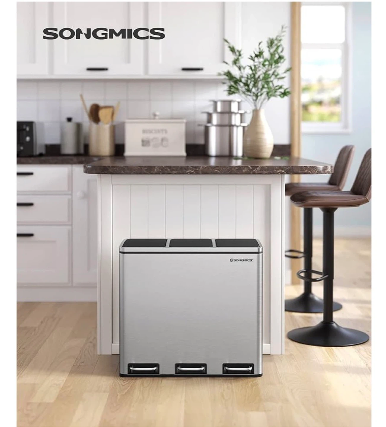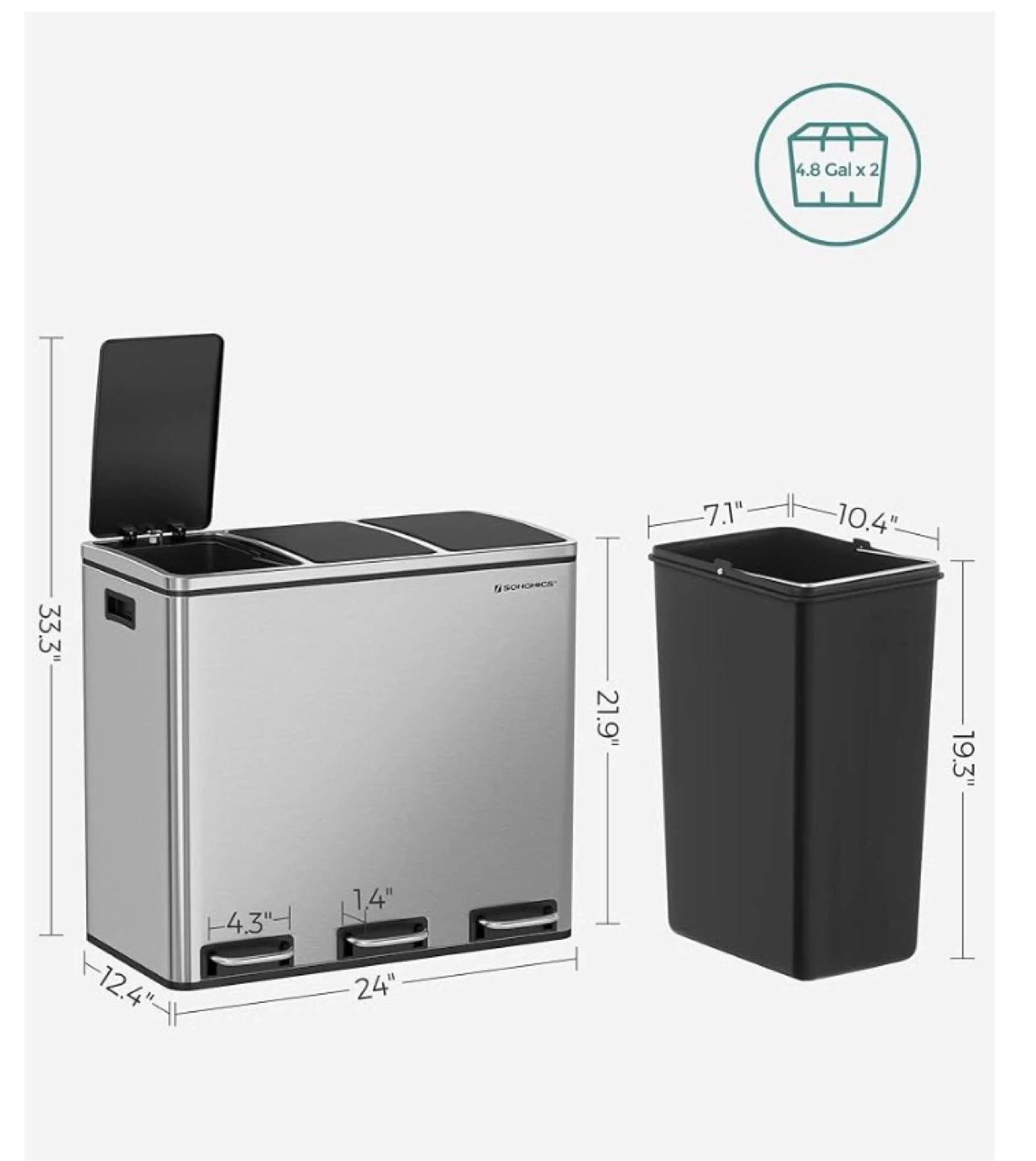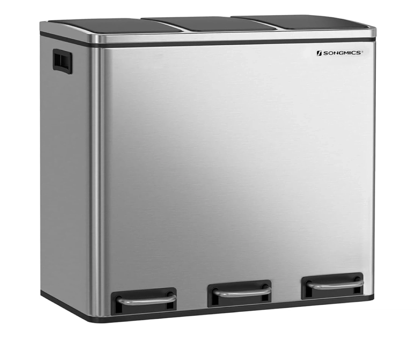 This SONGMICS trash can features three separate compartments for easy sorting. It's made of durable stainless steel with a brushed finish. Each compartment has a soft-close lid operated by a foot pedal. Total capacity is 4.8 gallons (2 bins of 2.4 Gal each).