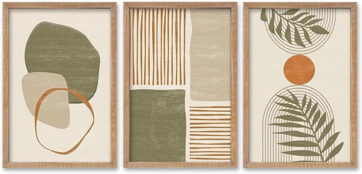 This set includes three framed canvas prints with a modern abstract design. Each piece features a neutral colour palette with green, beige, and orange tones. They're great for adding a touch of style to any room!