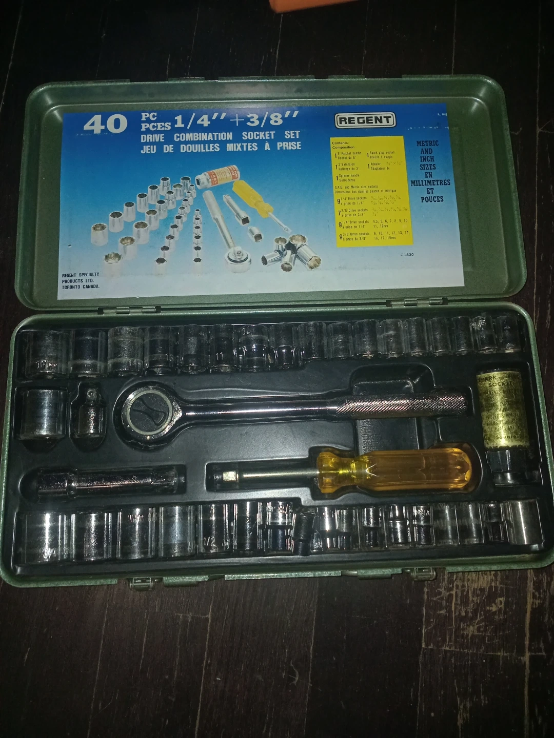 This Regent socket set includes 40 pieces with both 1/4" and 3/8" drives. It comes with SAE and Metric size sockets, a ratchet handle, a spinner handle, and a spark plug socket. Great for general repairs and maintenance!