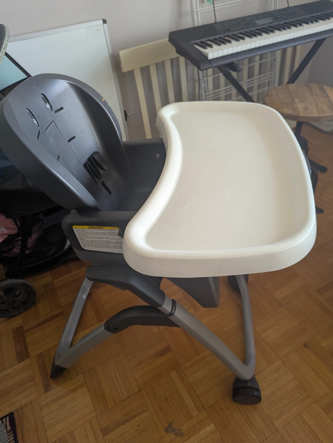 This is a Graco high chair in grey and white. It features a removable tray for easy cleaning. This chair is suitable for feeding babies and toddlers.