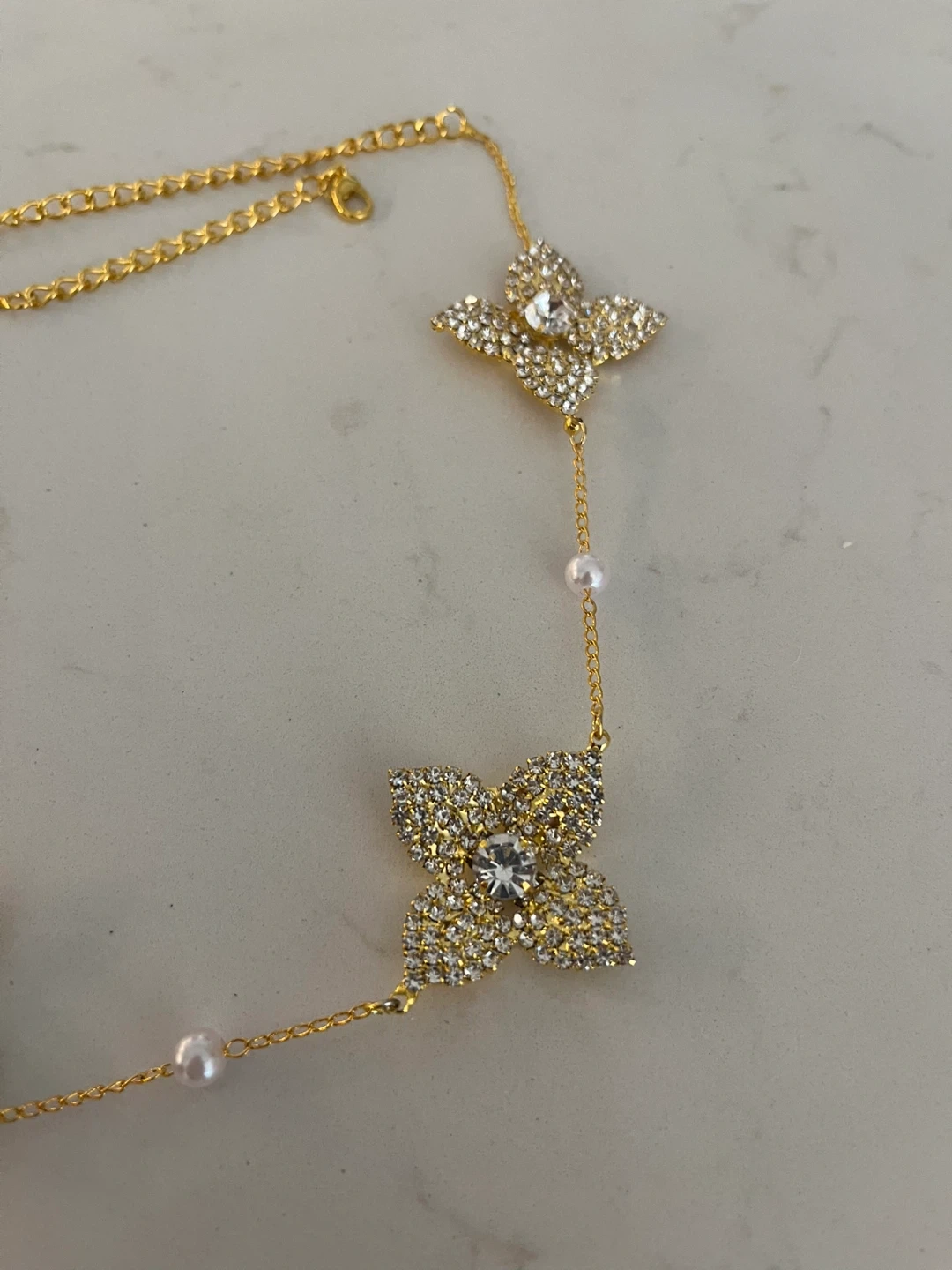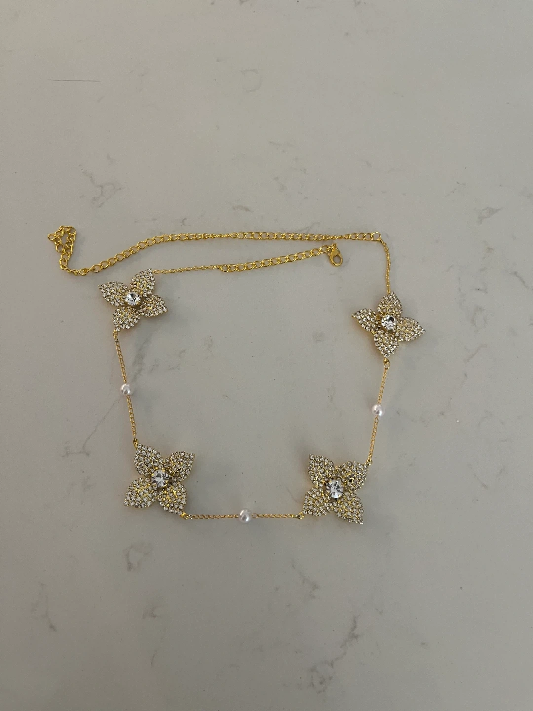 This delicate gold-tone necklace features four clover-shaped charms encrusted with rhinestones, interspersed with small faux pearls. It's a stylish accessory that adds a touch of sparkle. Perfect for dressing up any outfit!