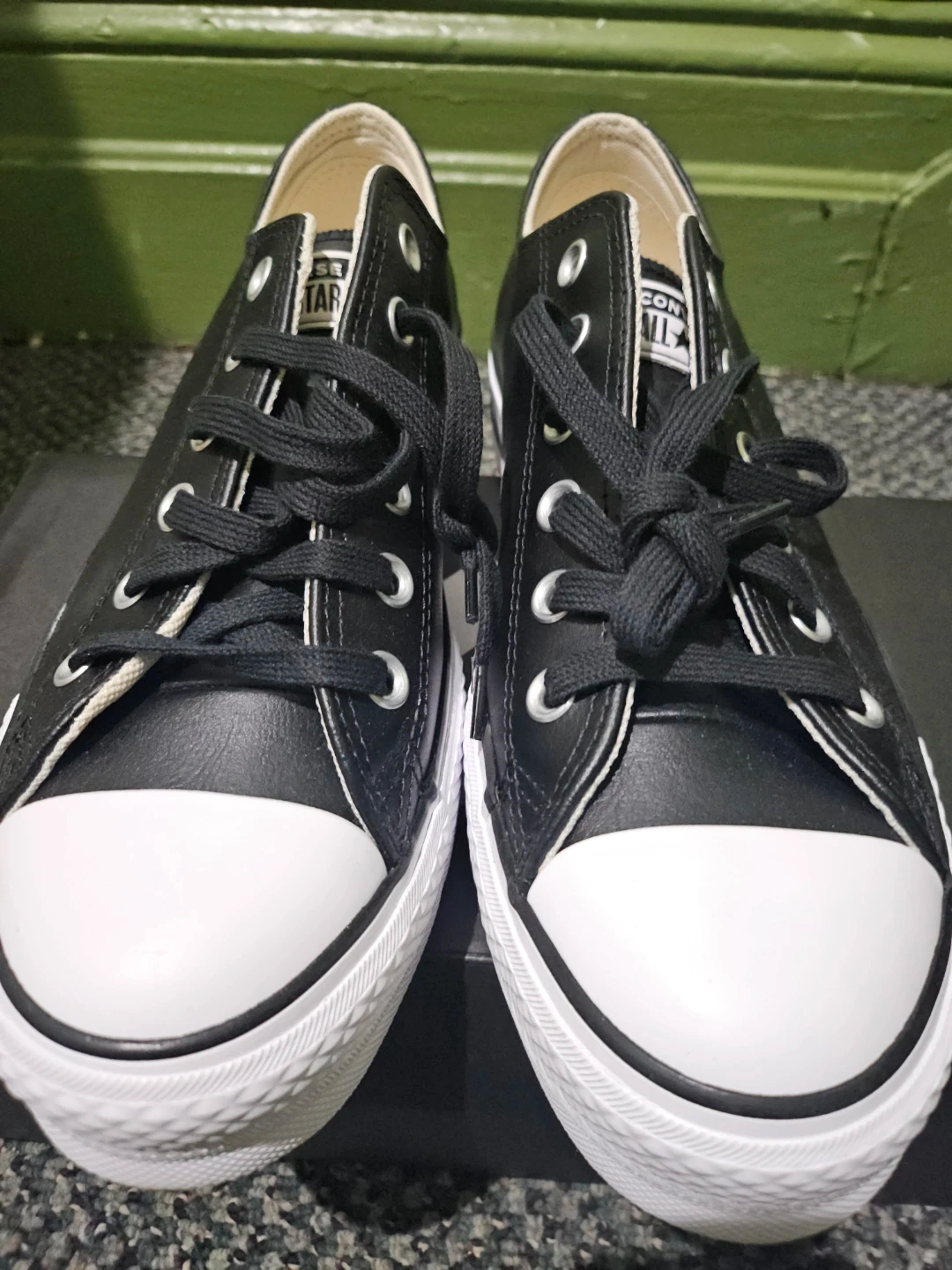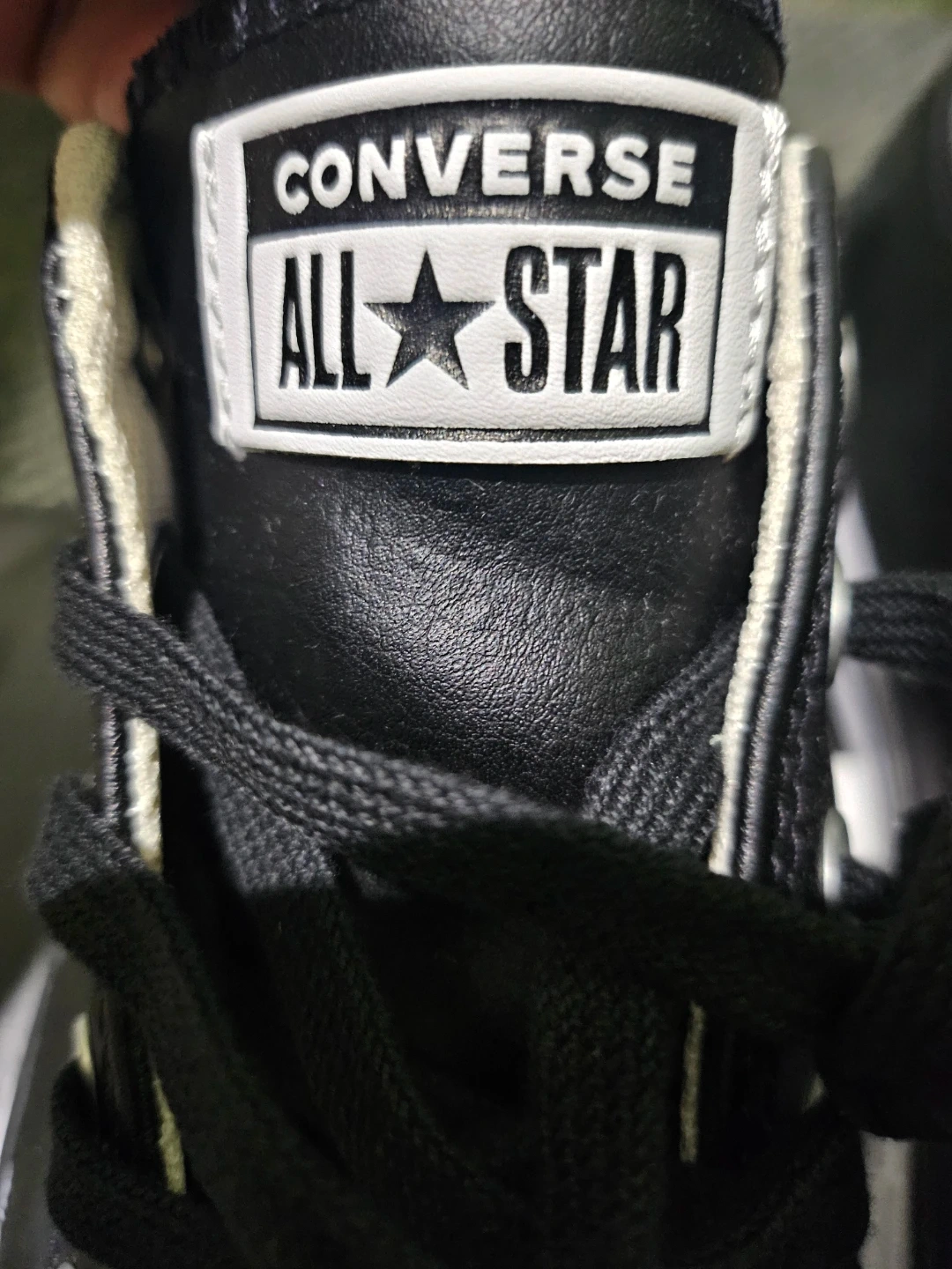 Converse low-top sneaker in black leather. Features All Star logo on the tongue. Black laces and contrasting white logo patch. Timeless casual design.