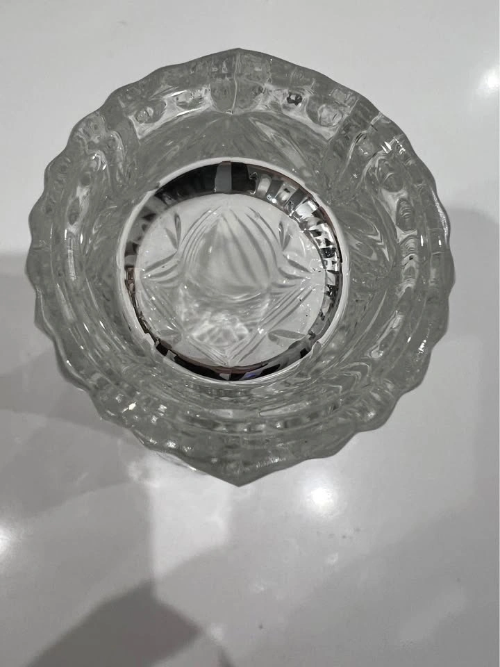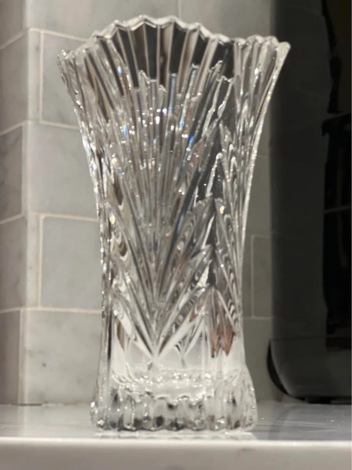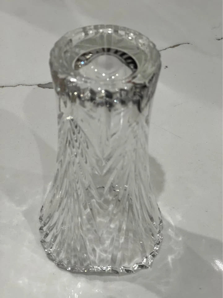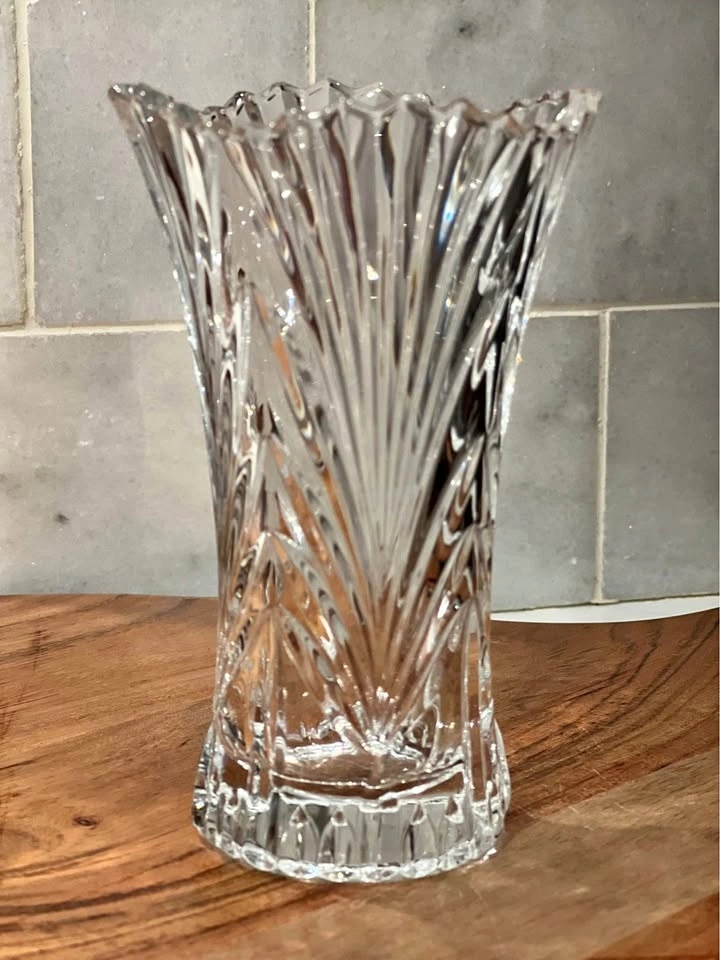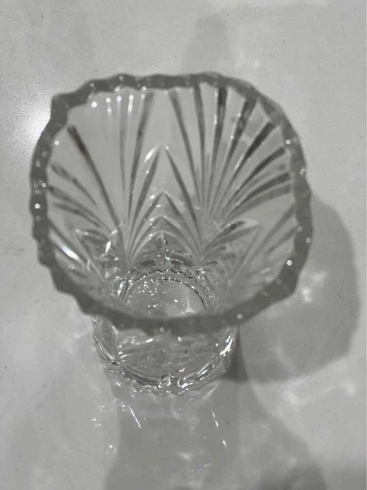 Beautiful Mikasa Accent bud vase, crafted from clear cut crystal. It features a flared, sawtooth-style rim with deep vertical and angular cuts, creating a lovely sparkle and shine. This small vase is in excellent, pre-owned condition with no damage and would make a very nice gift. Part of the "Accent" or "Triad" collections, known for its geometric cut patterns. Crafted in Japan. Measures approximately 4.75 inches tall with a 3" top diameter and 2" bottom diameter. Pickup is at 58th and 7th Ave in midtown Manhattan.