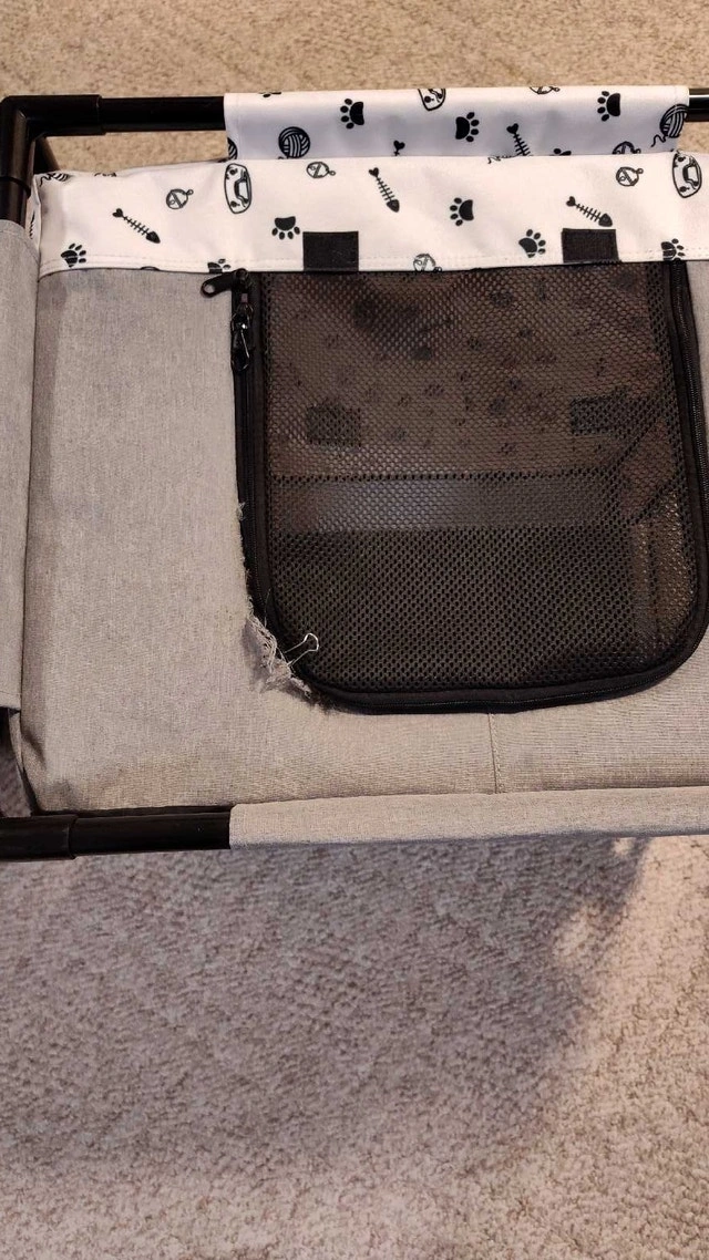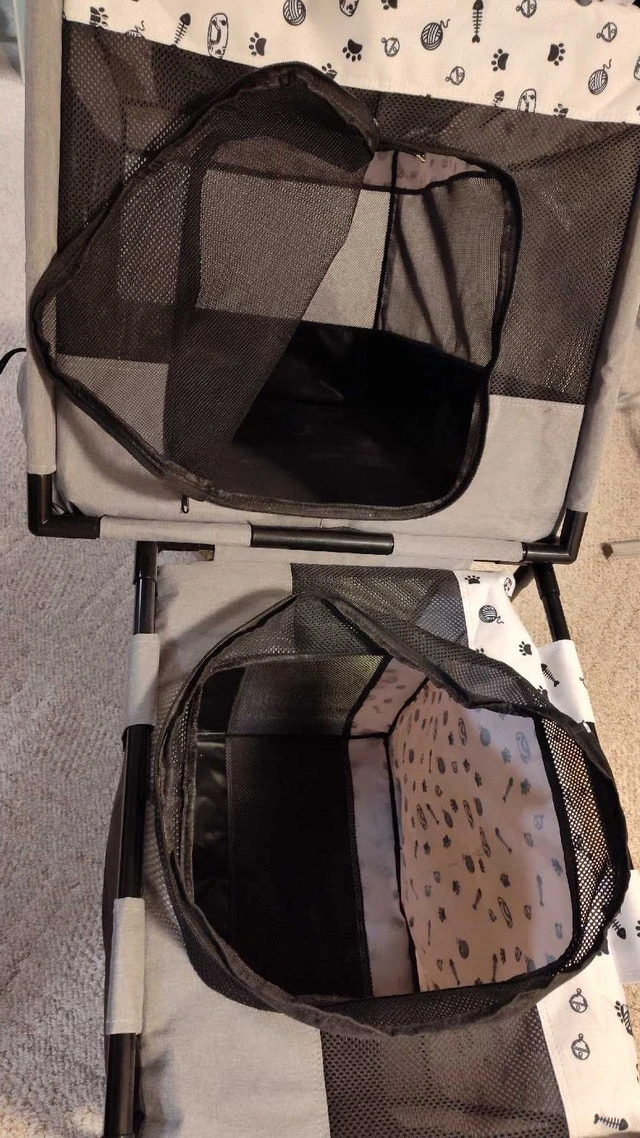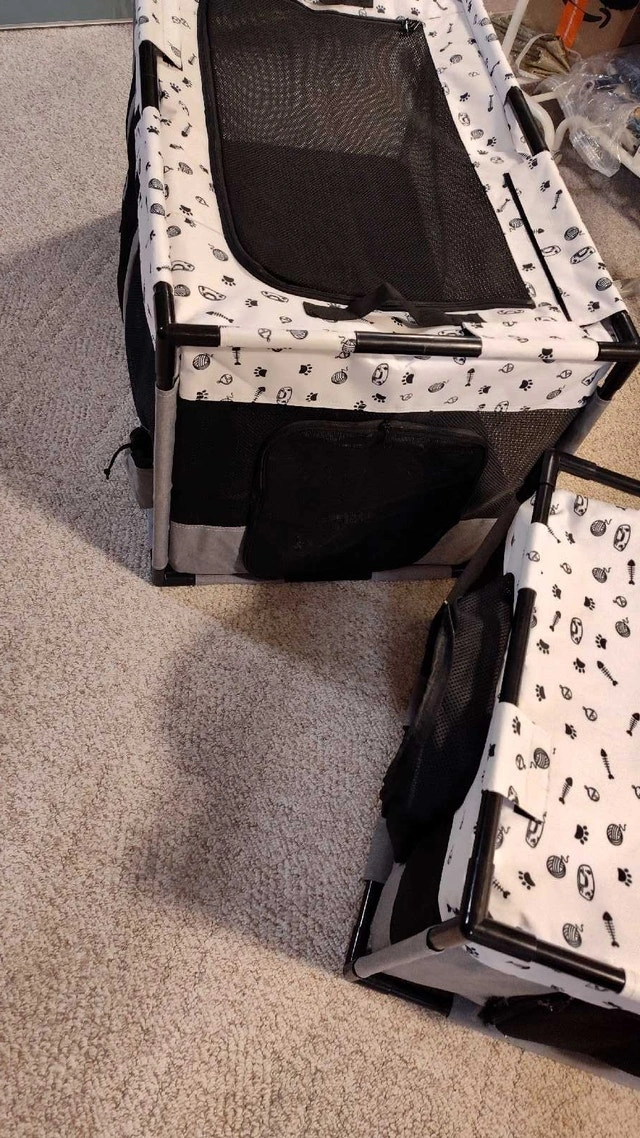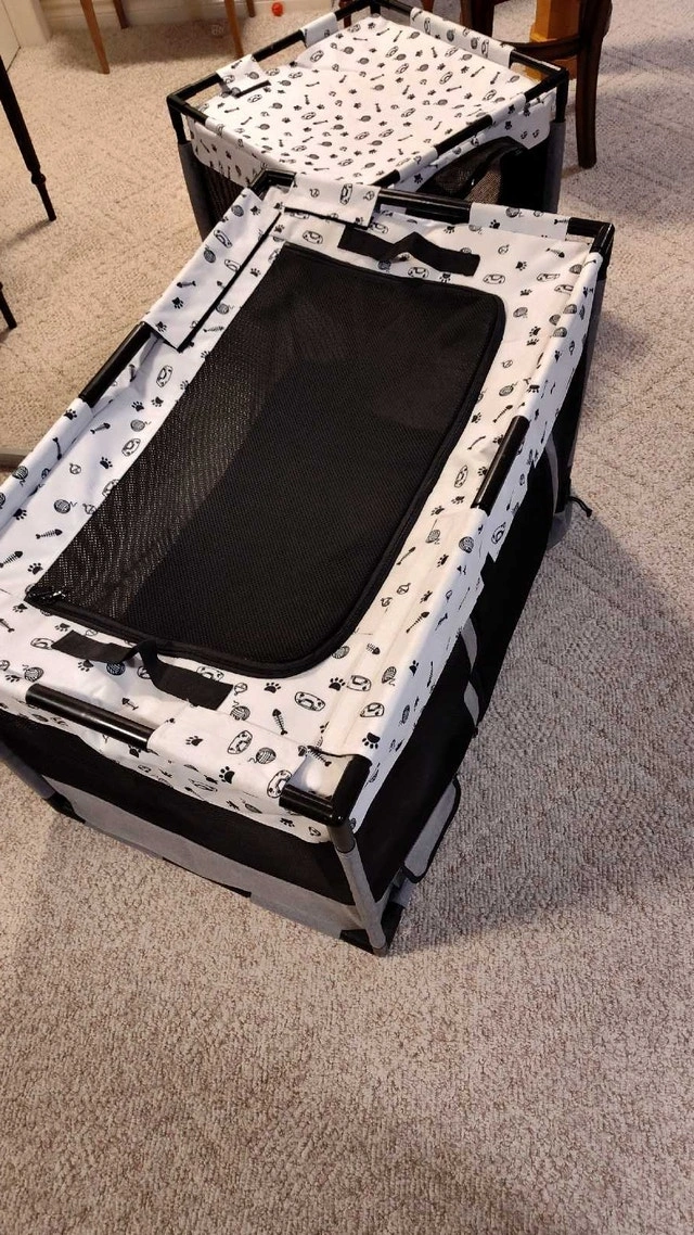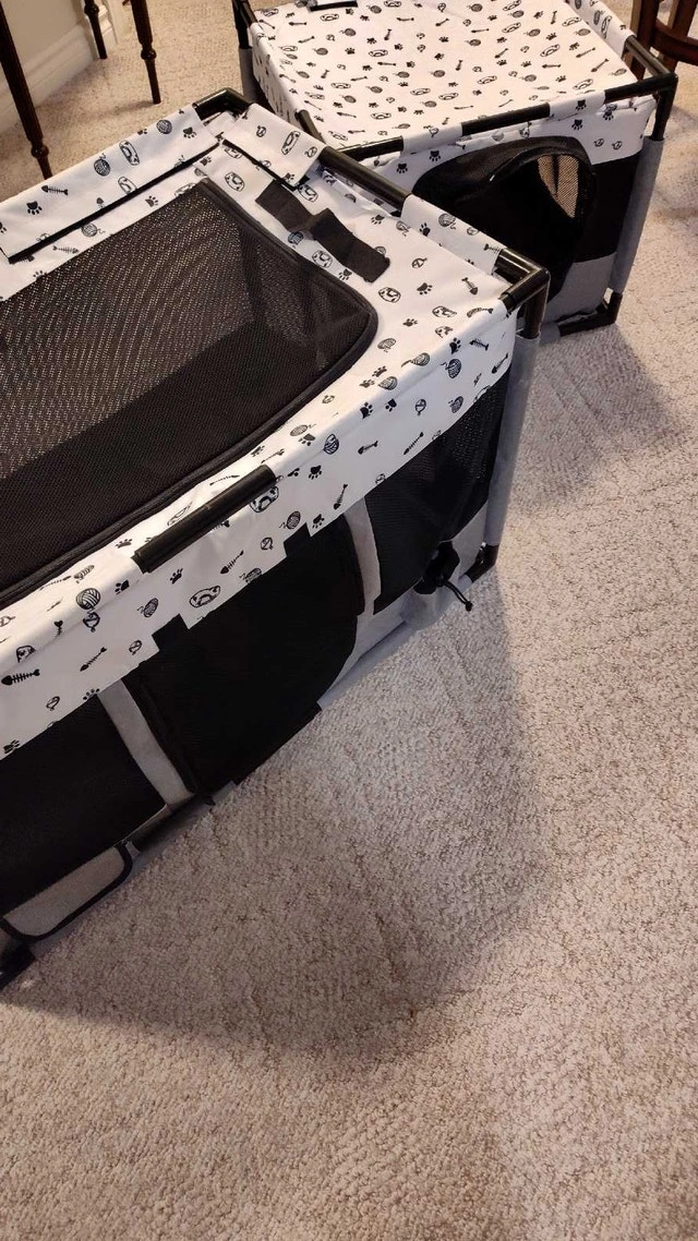Portable cat and dog playpen, suitable for indoor or outdoor use. Features a functional partition design with two separate areas, ideal for feeding, resting, playing, and litter box use (fits litter boxes up to 18.5"). Large size: 39"L x 24"W x 22"H. Can be used for puppies, kittens, cats, small dogs, rabbits, etc. Includes a stable PVC pipe frame and is made from durable, scratch-resistant, waterproof 600D Oxford cloth and mesh. Good used condition, but there is a small tear near the zipper that needs repair. Asking $50. Pick up in Mississauga near Britannia Rd and Ninth Line or Winston Churchill Blvd.