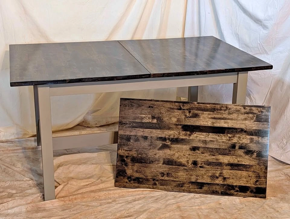 You won't find this stain color in stores; it doesn't exist! Made by me, it's one of a kind with a nice gray base. Dimensions are 3 ft by 5 ft, and the leaf is an extra 21 in. The leaf stores inside when not in use for a handy addition. The color pops and changes as you move in the light. Don't miss this opportunity – no one else has one of these!