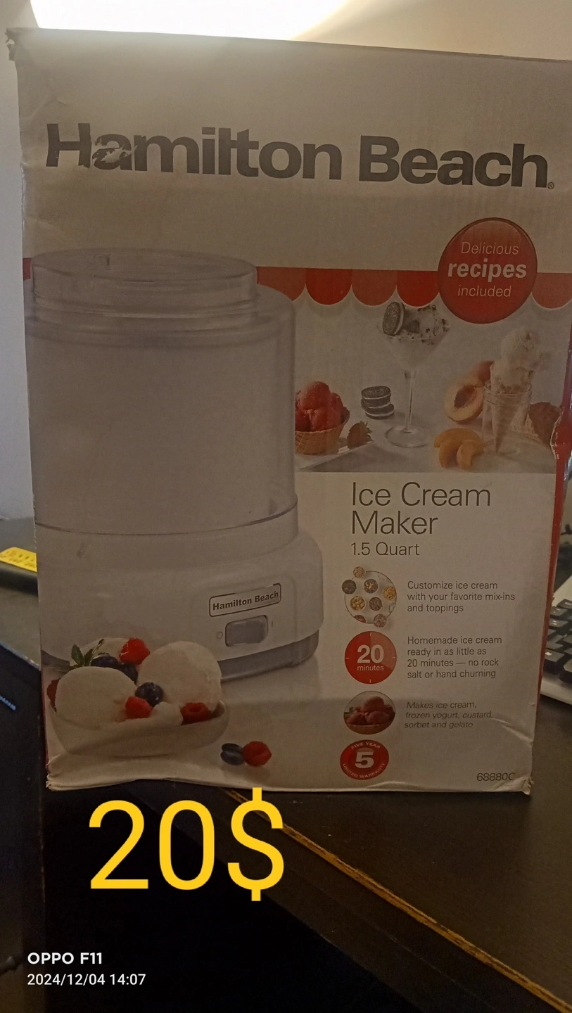 Ice cream maker, makes ice cream, frozen yogurt, custard, sorbet and gelato. Recipes included.