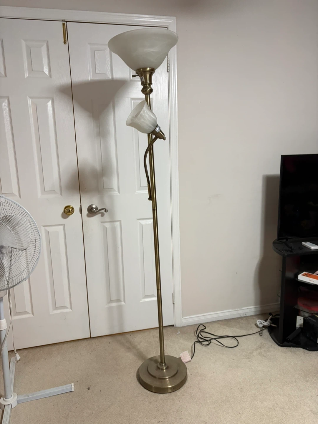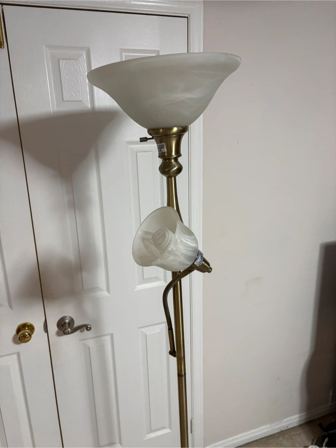 Brass finish torchiere floor lamp with an adjustable accent light. It's perfect for adding extra light to any room. The main shade is frosted glass, and the accent light has a smaller frosted glass shade.