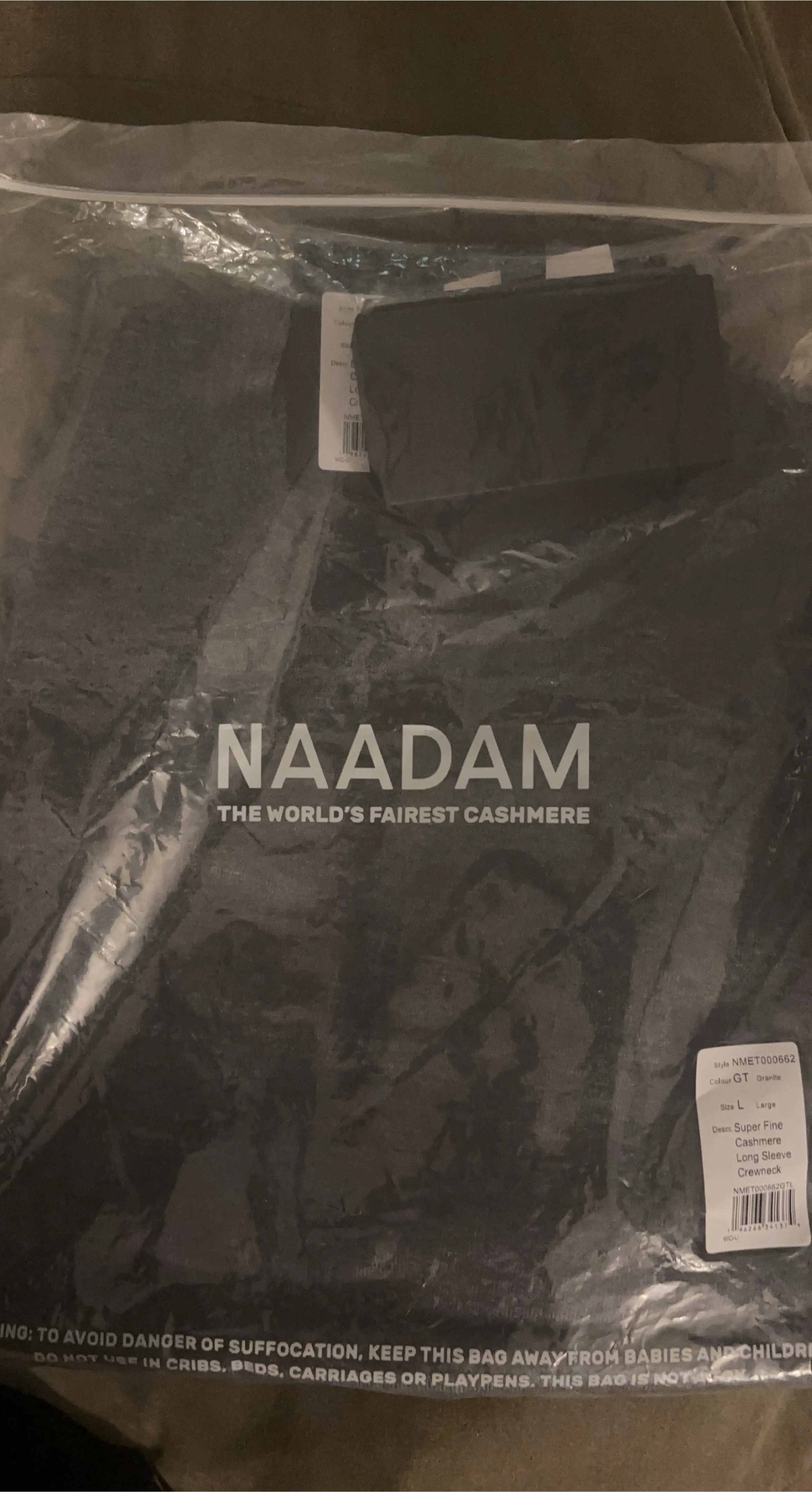 Selling a NAADAM Super Fine Cashmere Long Sleeve Crewneck in size Large. The colour is Granite. It's still in the original packaging!