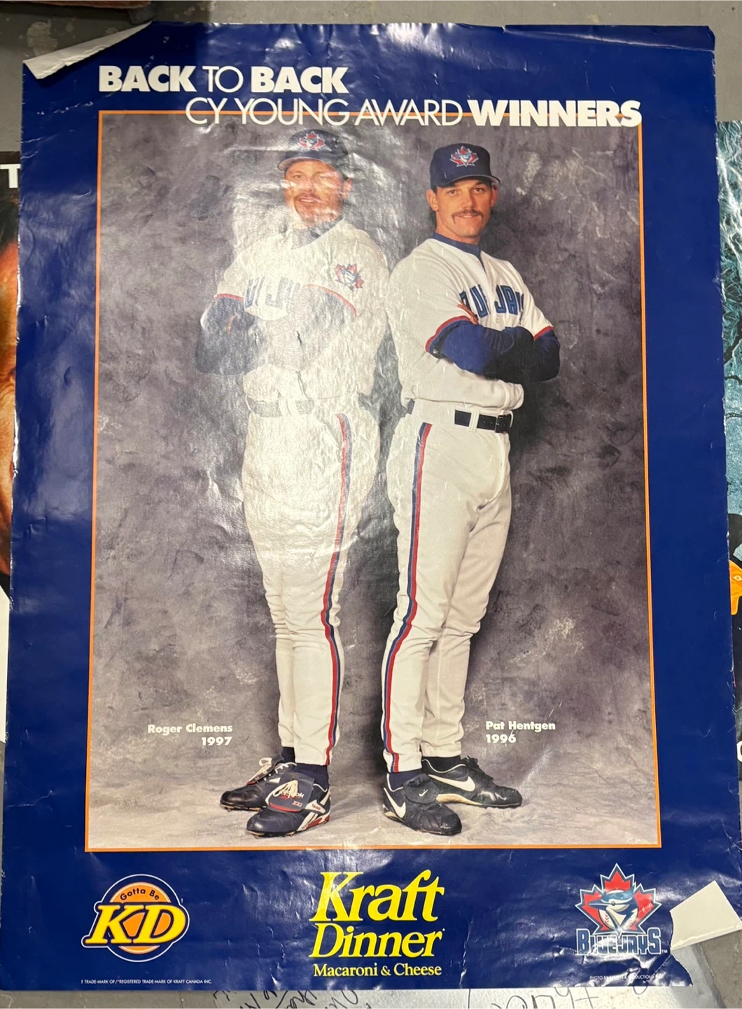Details:• Players: Roger Clemens (1997) and Pat Hentgen (1996)• Team: Toronto Blue Jays• Sponsored by Kraft Dinner• Classic 1990s baseball memorabilia• Large glossy sports poster