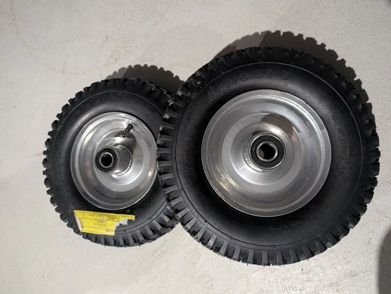 Two pneumatic tires with aluminium rims are included. These tires are size 4.10/3.50-6. They're suitable for equipment that requires durable wheels. Maximum inflation pressure is 30 PSI.