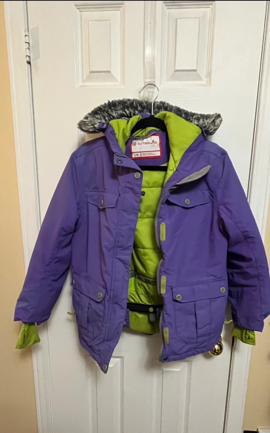 This is an Outbound purple winter jacket. It features a lime green lining and a faux fur-trimmed hood. The size is L/G kids or Small for adult. This jacket is suitable for colder weather activities.