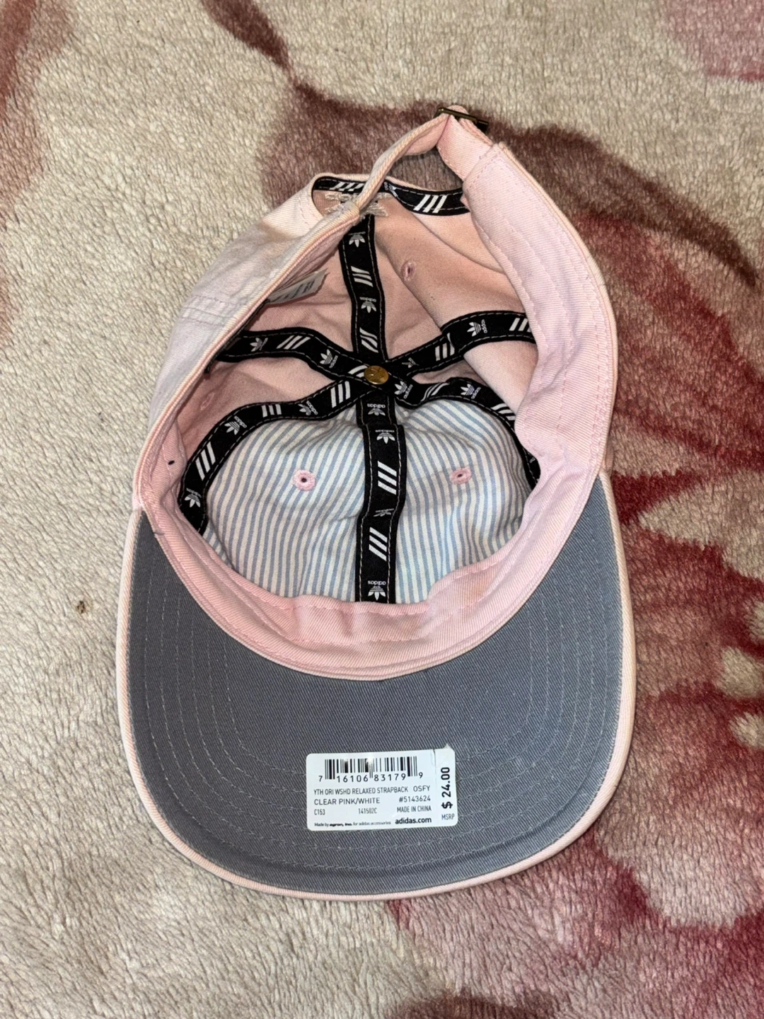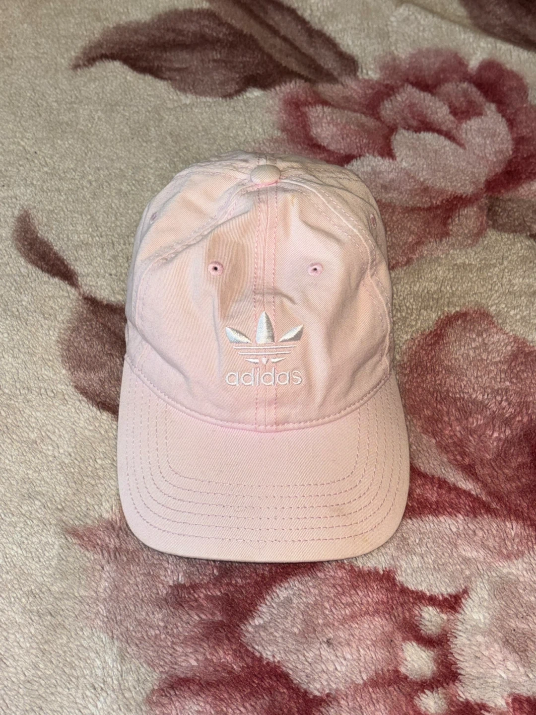 Kids Adidas relaxed strapback baseball cap. It's a light pink color with the classic Adidas logo embroidered on the front. The hat has an adjustable strap for a comfortable fit.