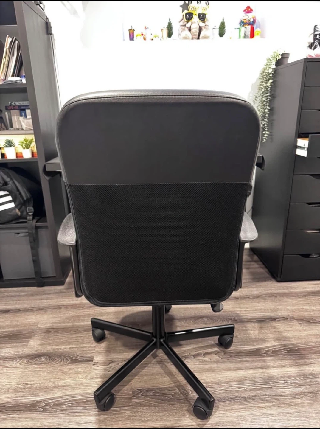 This is a black office chair with a mesh back panel. It's designed for comfort and has rolling casters. Great for a home office setup!