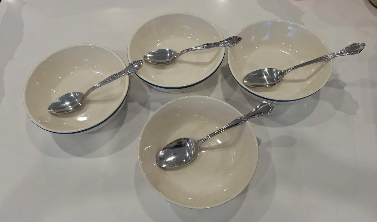 Set of 4 nice bowls - rarely used - have been in storage most of the time and 4 spoons. Two spoons are slightly smaller that the other 2.