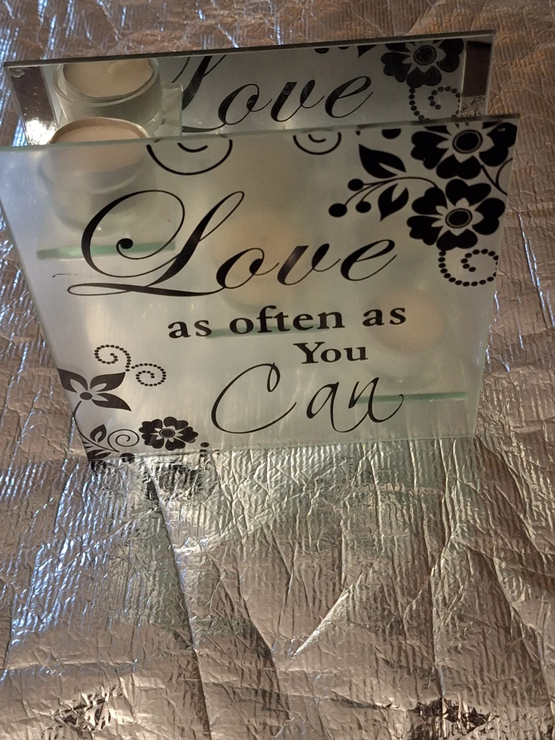 This glass tealight holder features a frosted front with a black decal that says "Love as Often as You Can". It includes three tea lights. It's made of glass.