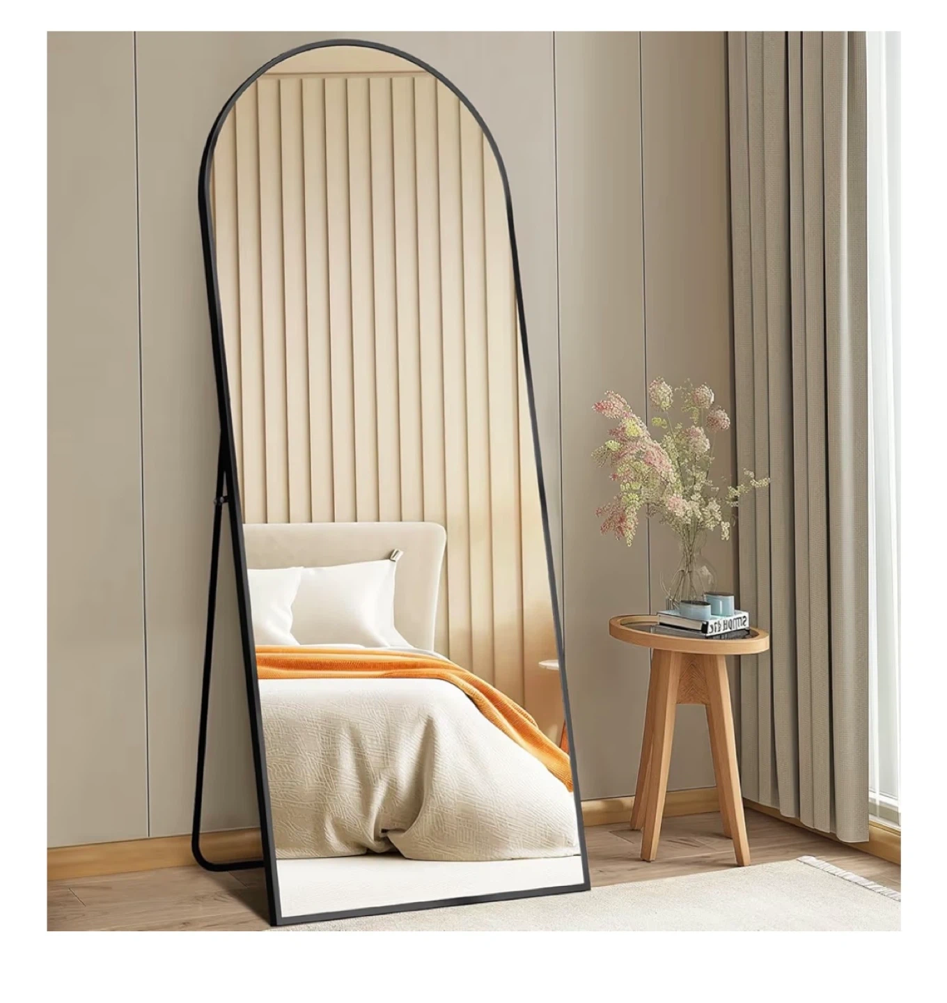 This tall, arched floor mirror features a sleek black metal frame. It's perfect for checking your outfit or adding a decorative touch to any room. The mirror is freestanding and has a stable base.