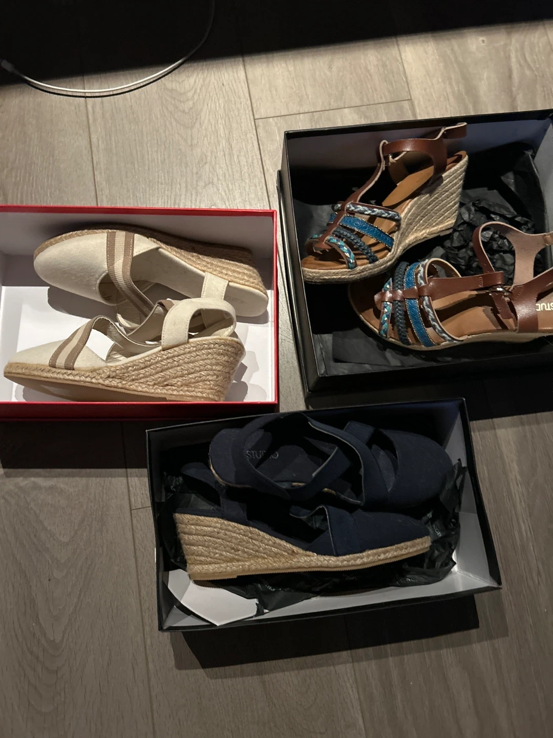 Comfortable espadrille wedge sandals in a neutral beige, blue and brown colourways. Features jute soles and adjustable ankle straps. Perfect for warm weather wear!