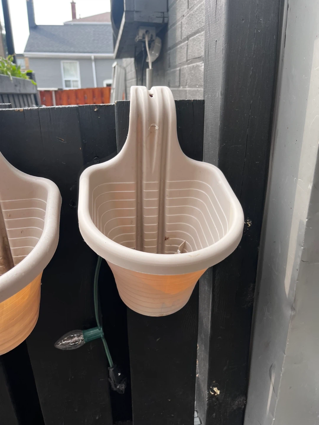 This set includes three beige hanging planters. They're made of durable plastic and designed for outdoor use. These planters are great for adding some I greenery to your fence or railing!
