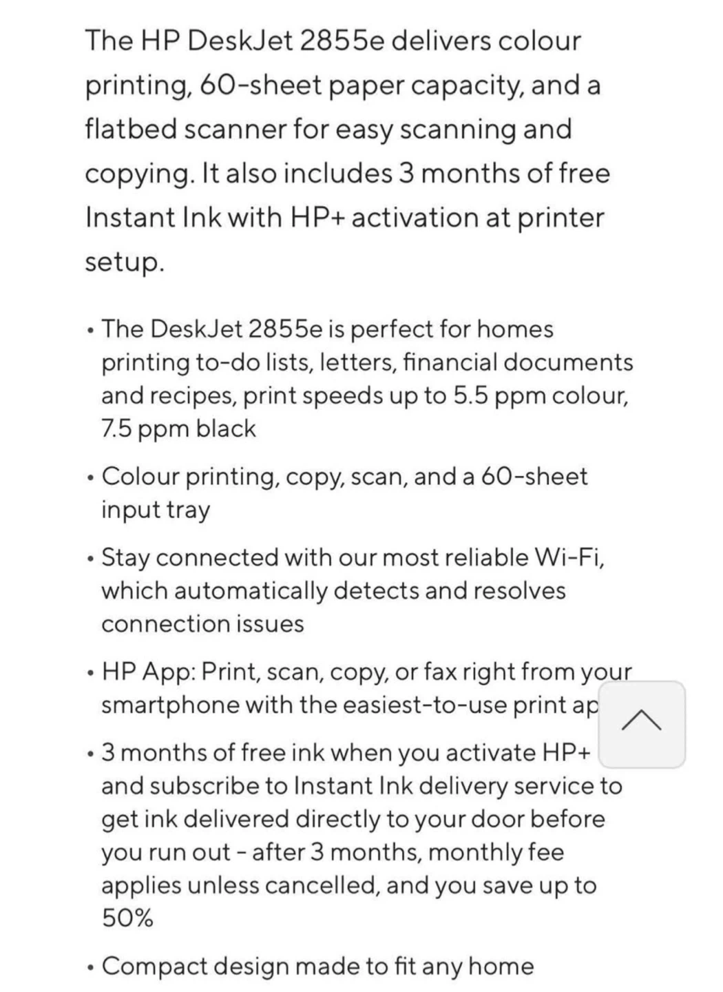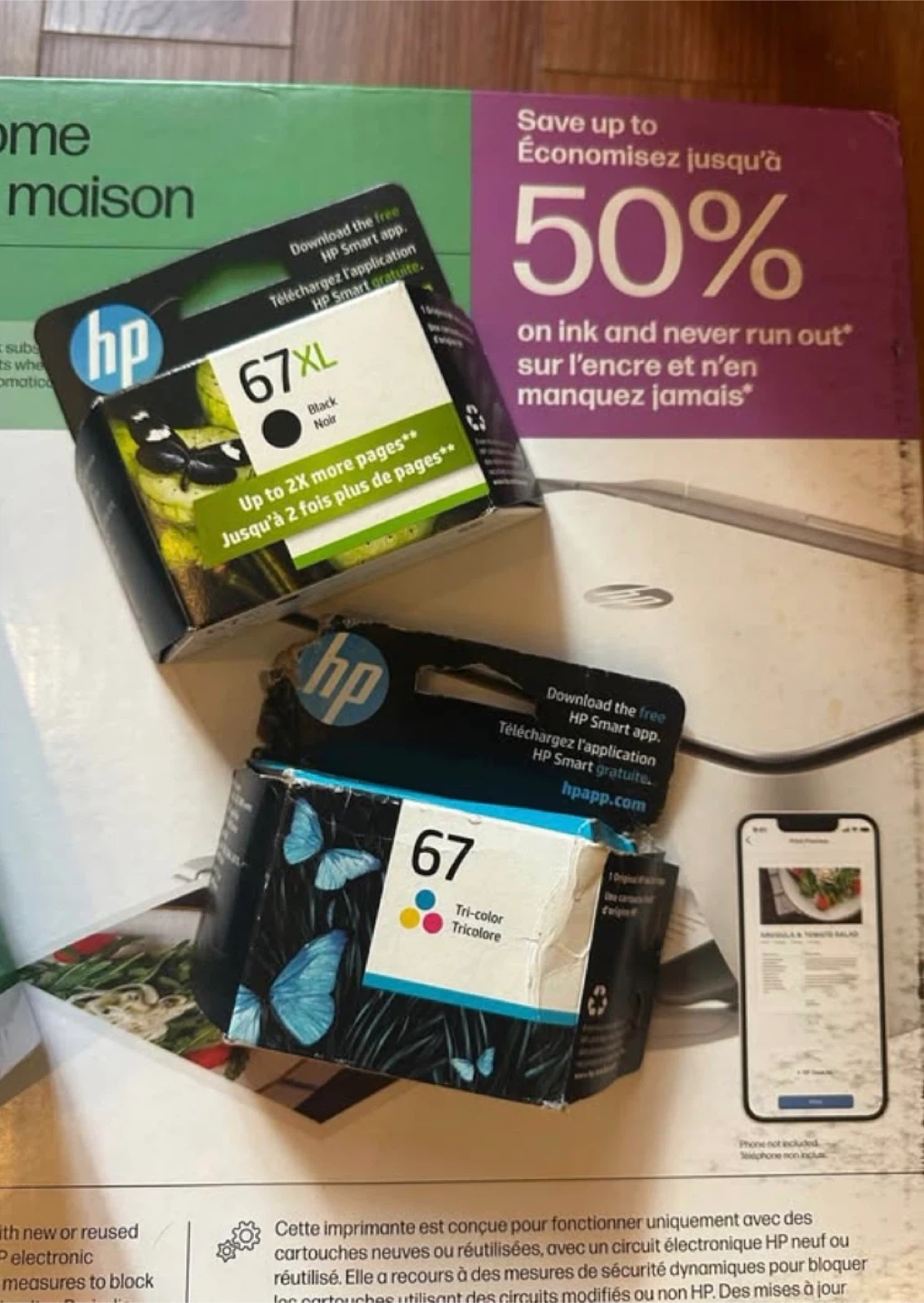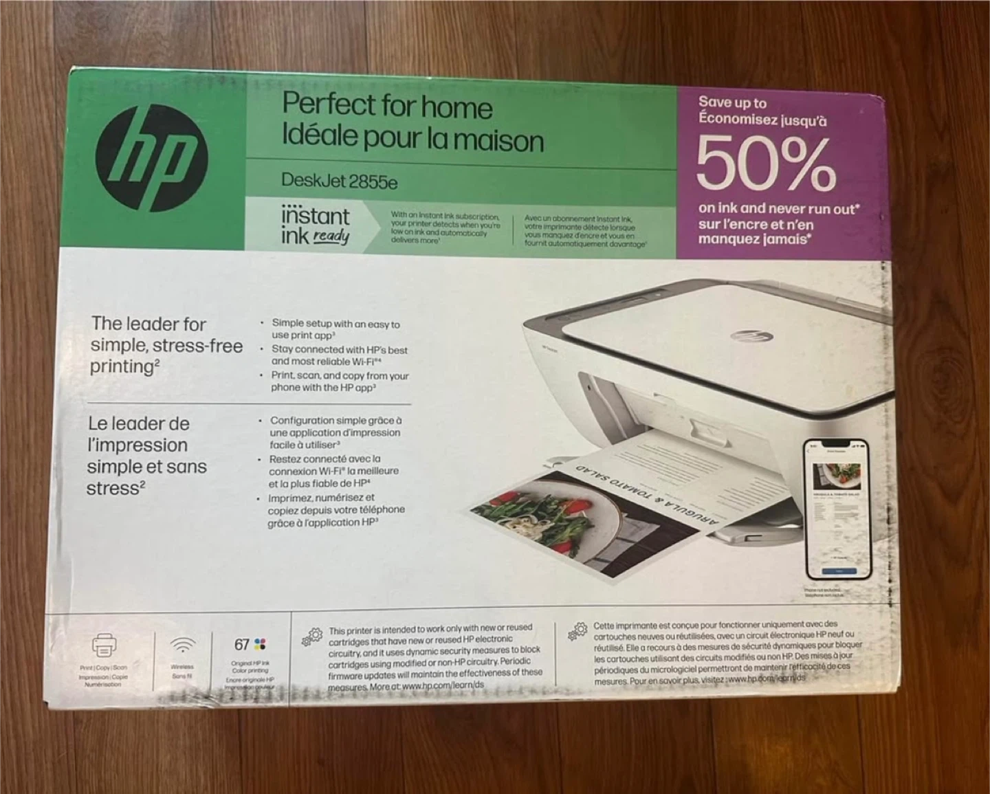 Selling an HP Deskjet 2855e printer, perfect for home use! It's designed for simple, stress-free printing, and is instant ink ready. Also included are HP 67 and 67XL ink cartridges. Great for everyday printing needs!