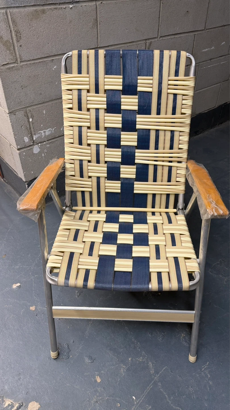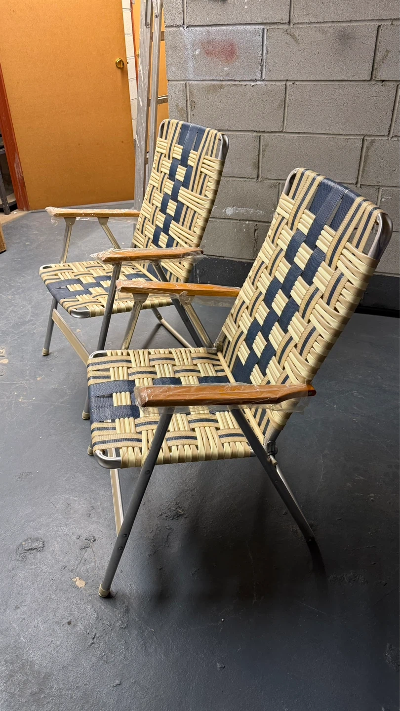 Classic foldable webbing chairs with metal frames and wood armrests. These chairs feature a durable woven fabric seat and back in blue and tan. They're perfect for outdoor gatherings or casual lounging. Aluminum frame, wood arms, woven webbing.