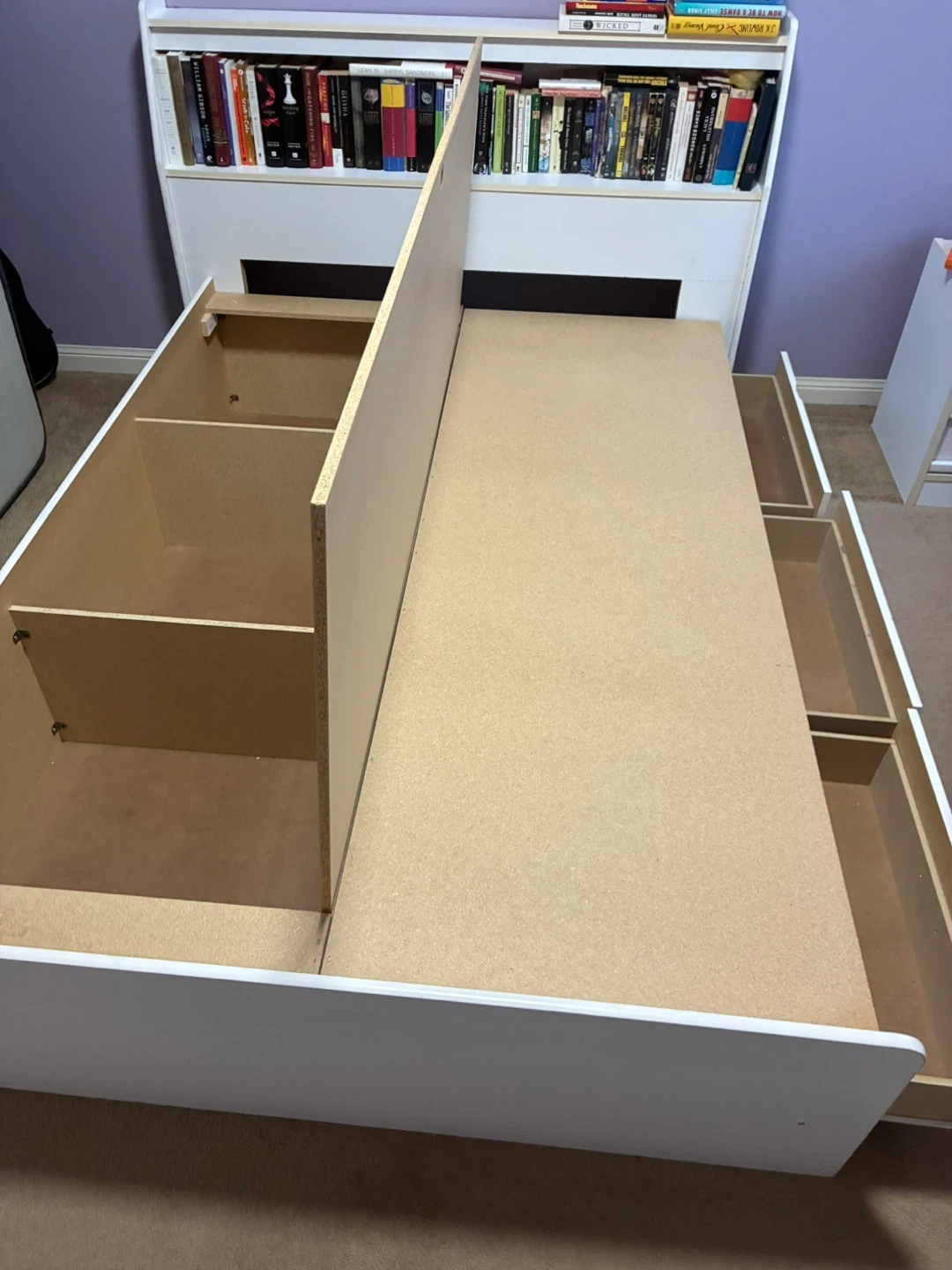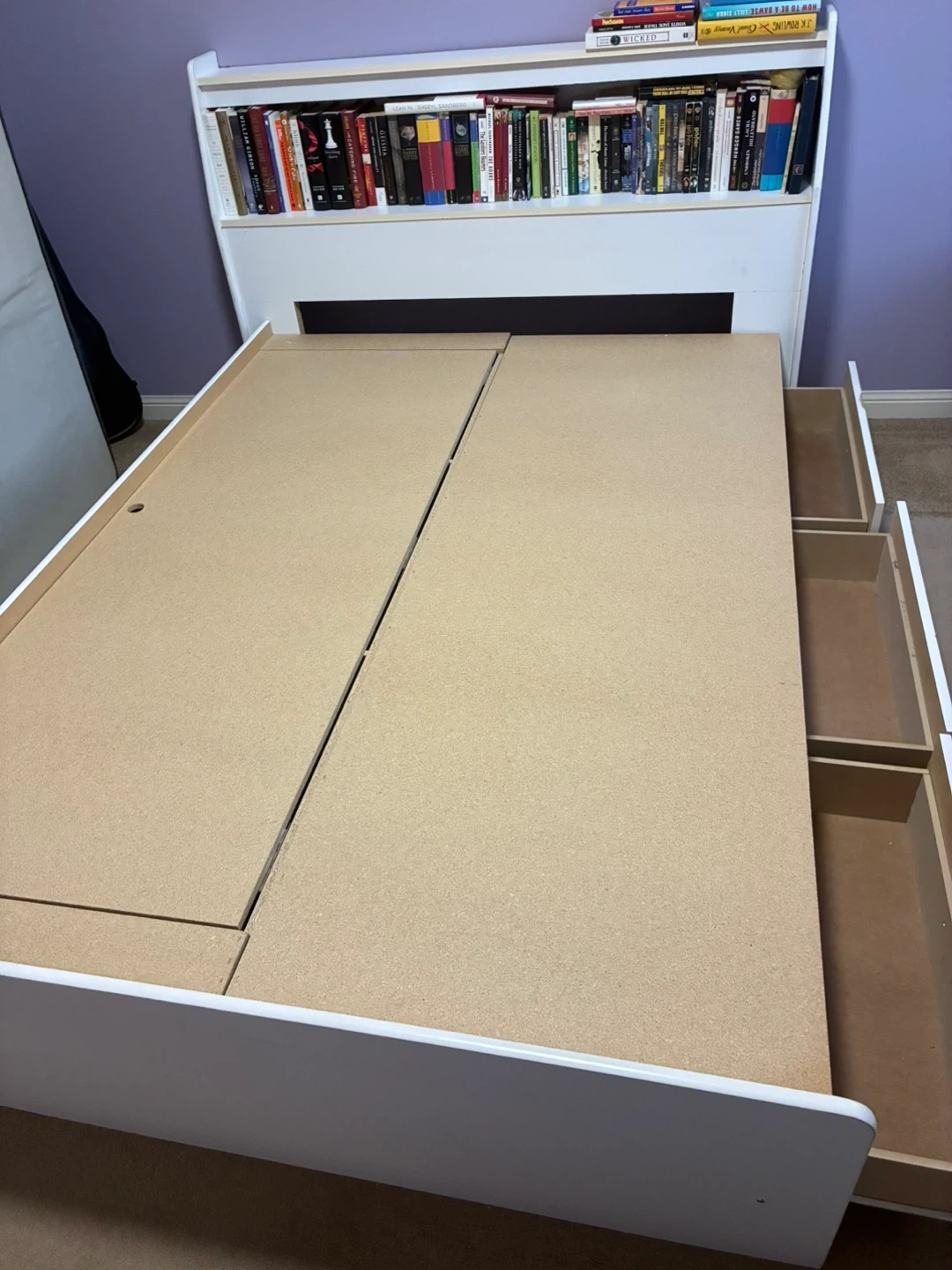 White Bed Frame with Storage and Bookshelf Headboard
