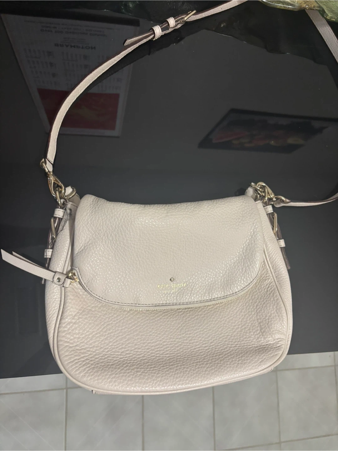 This is a light beach pebbled leather crossbody bag by Kate Spade. It has a zip-around closure and an adjustable strap. It's a versatile bag for everyday use.