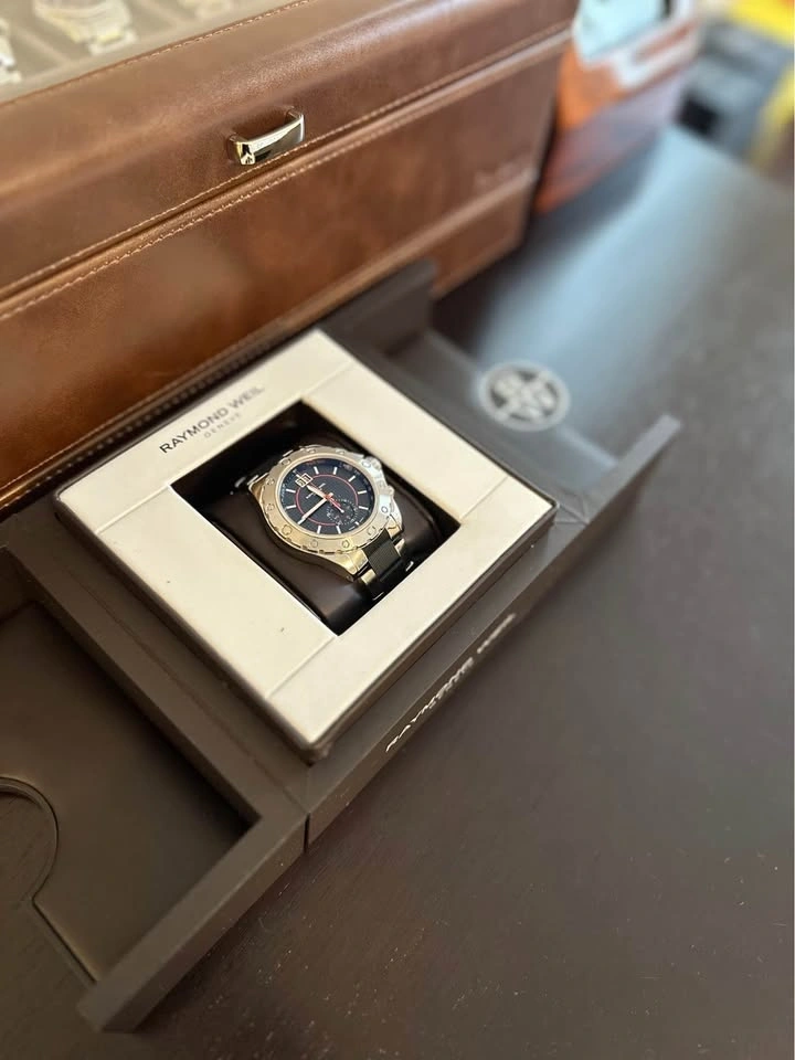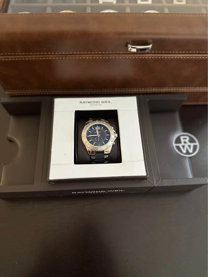 Luxury Raymond Weil Geneve Swiss chronograph watch in excellent condition. This is a high-quality Swiss timepiece with a sporty design and premium build.