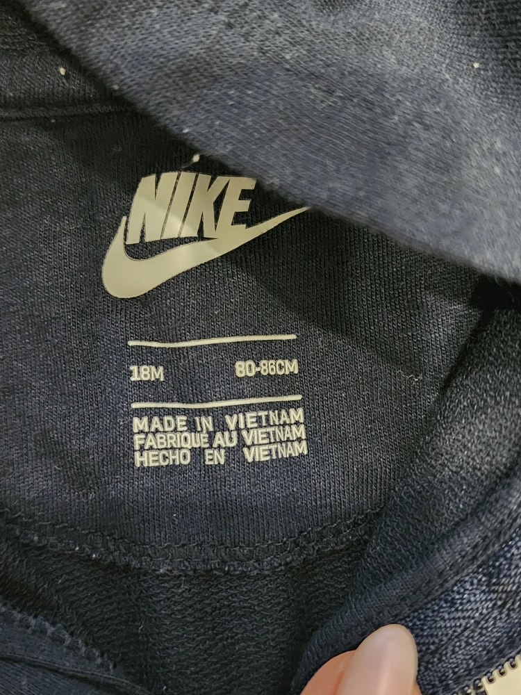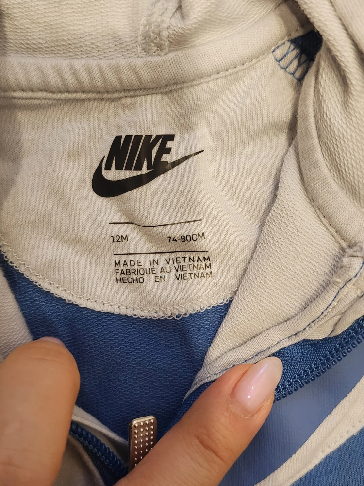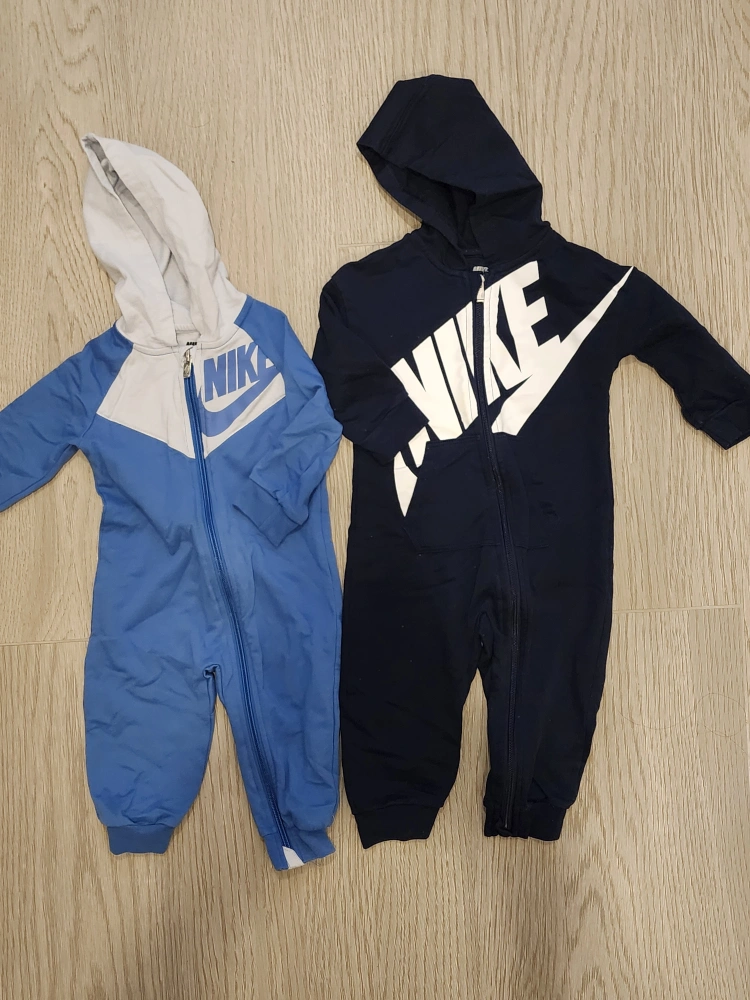 Blue and Navy baby boy onesies with white Nike logo and hood. Sizes 12M and 18M.