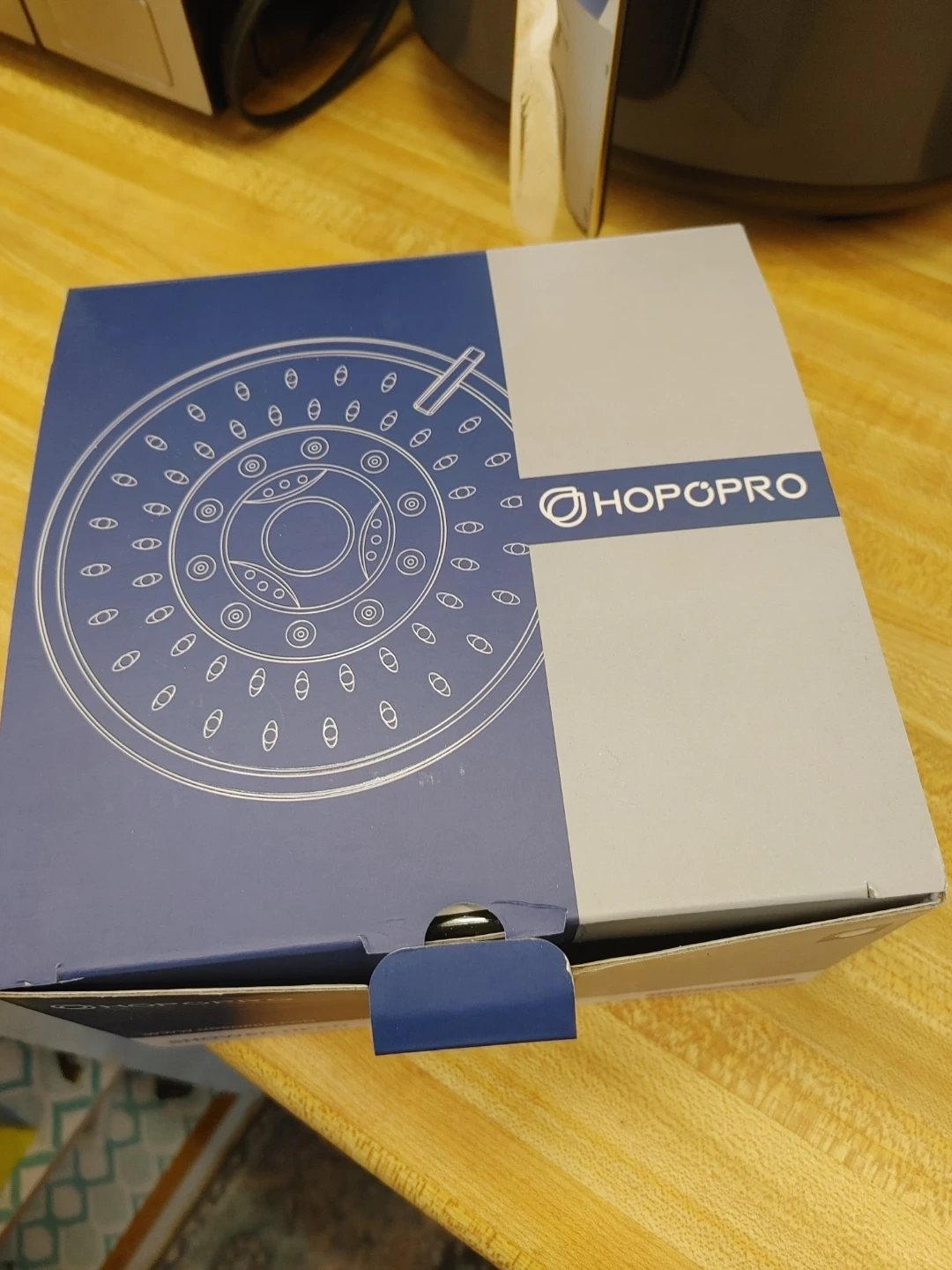 New HOPPRO shower head in original box. It's a grey and chrome shower head with multiple spray settings. Includes original packaging.