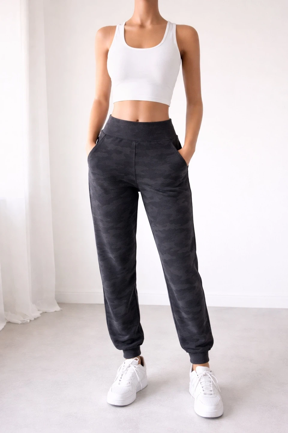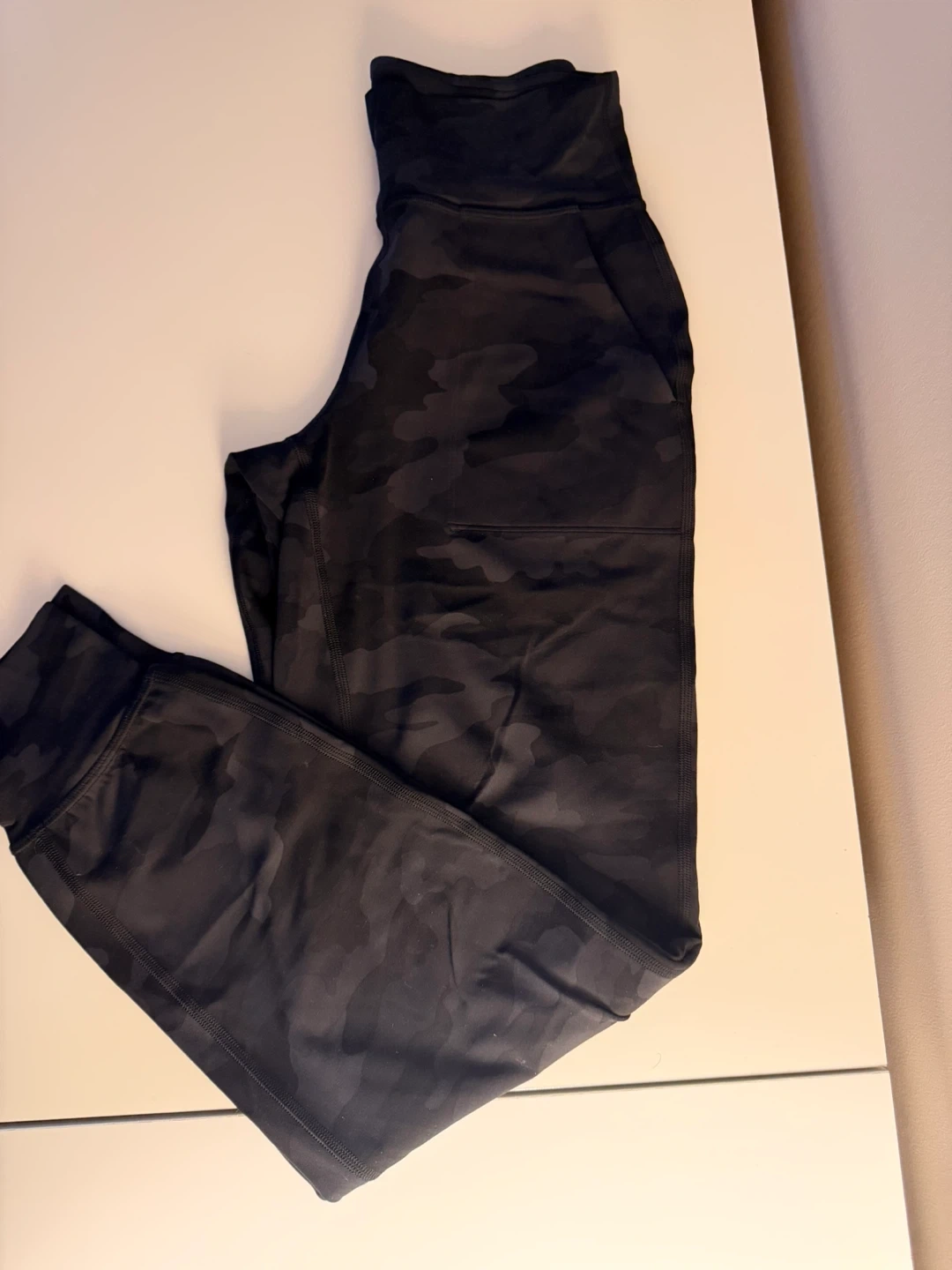 Comfortable Lululemon Align joggers in a black camouflage print. These pants are designed for everyday wear and movement. Made with soft, stretchy fabric for a great feel. Perfect for lounging or light activity.