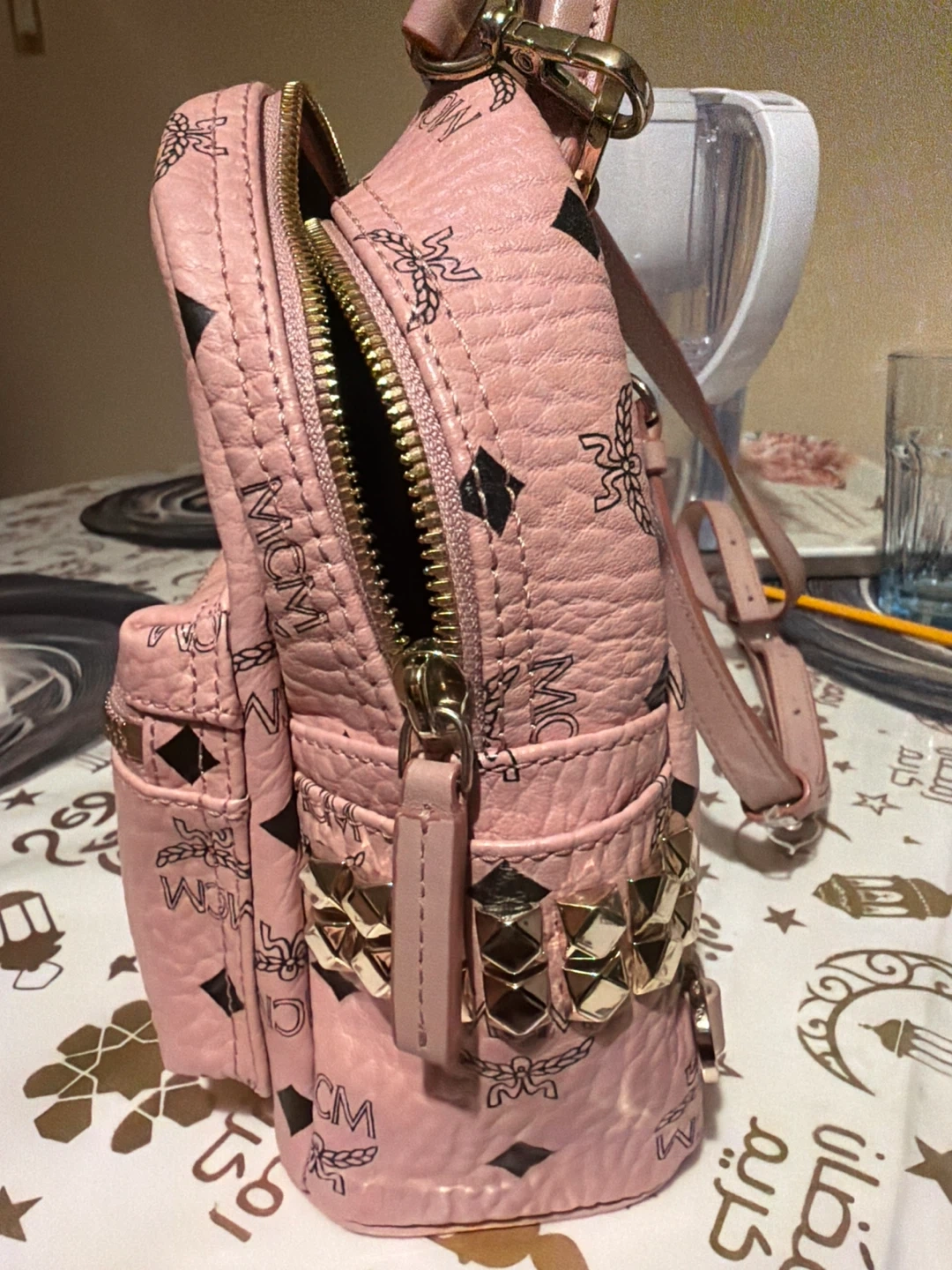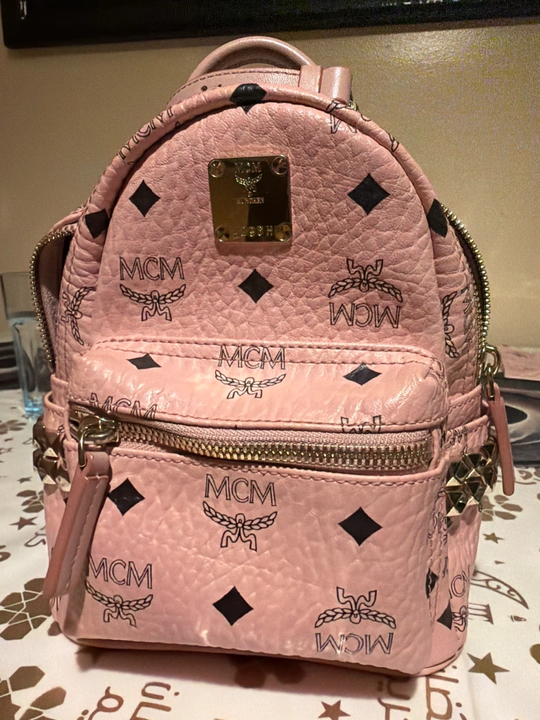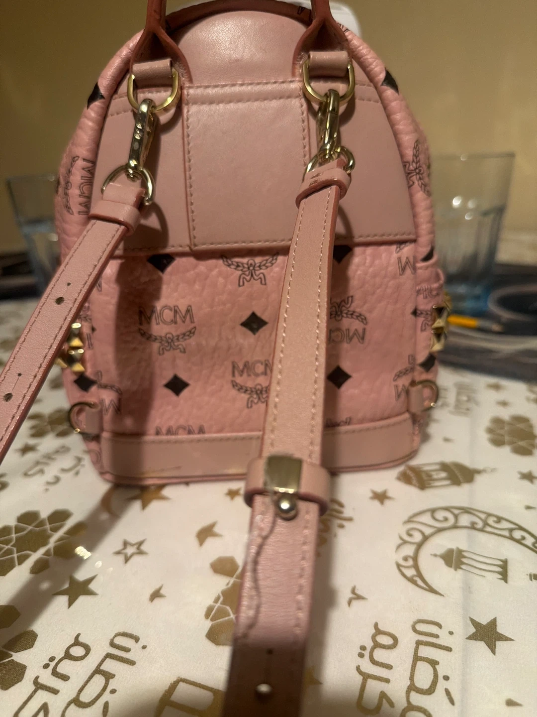 This MCM backpack is crafted from pink Visetos leather. It features the signature MCM monogram print and gold-tone stud embellishments. The bag includes adjustable shoulder straps and a top handle for versatile carrying options.