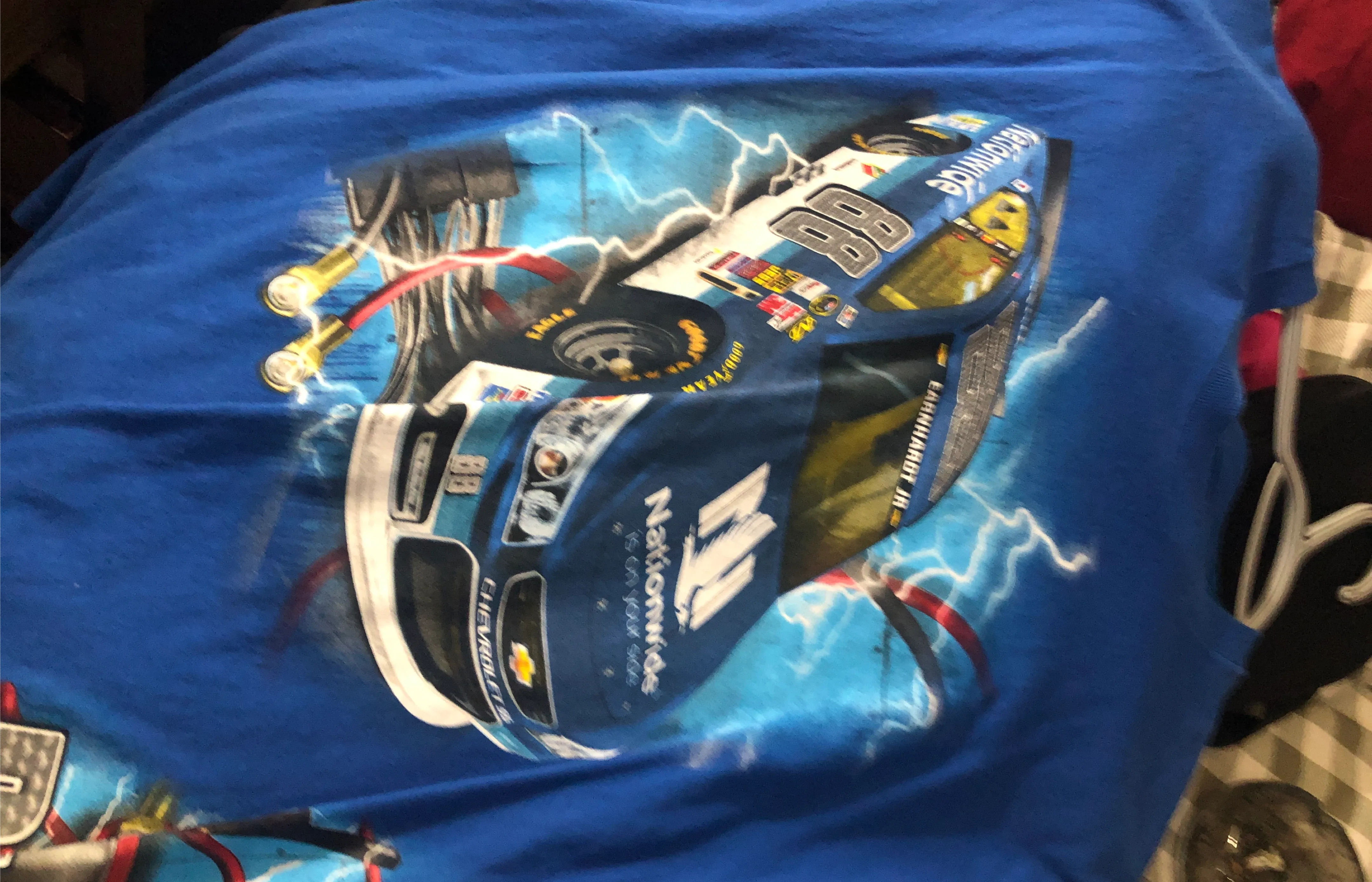 This is a blue t-shirt featuring Dale Earnhardt Jr.'s #88 Nationwide Chevrolet race car. It has lightning bolt graphics and the Goodyear Eagle tire branding. It's a great shirt for NASCAR fans!