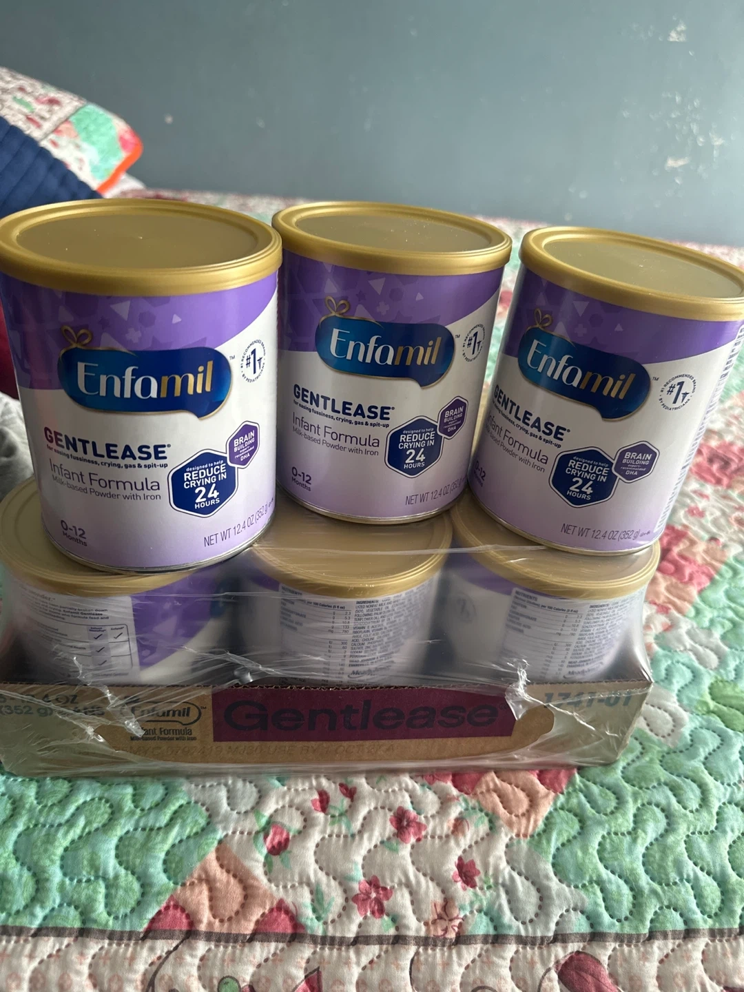 This is a 3-pack of Enfamil Gentlease infant formula. Each can is 12.4 oz and designed for babies 0-12 months. It's milk-based and contains iron to help reduce crying in 24 hours. Use by Oct 2024.