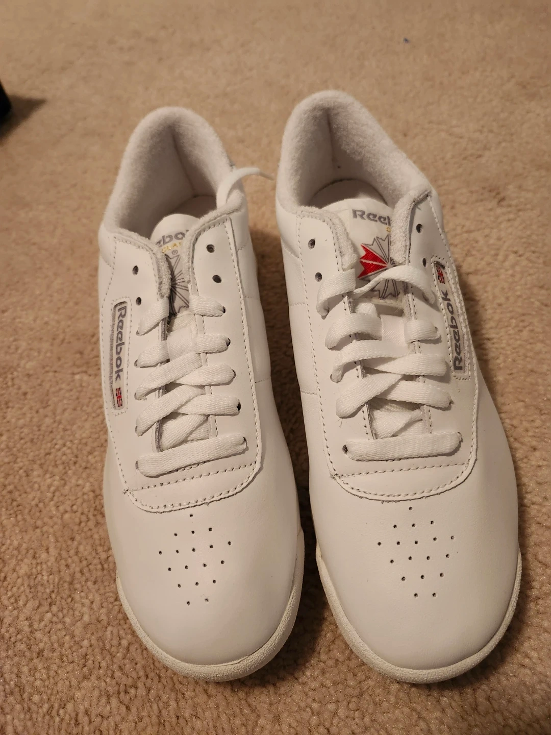 White Reebok Princess Classic sneakers for women. Leather upper with a rubber sole. Includes original box. These are a size 9 US. New condition.