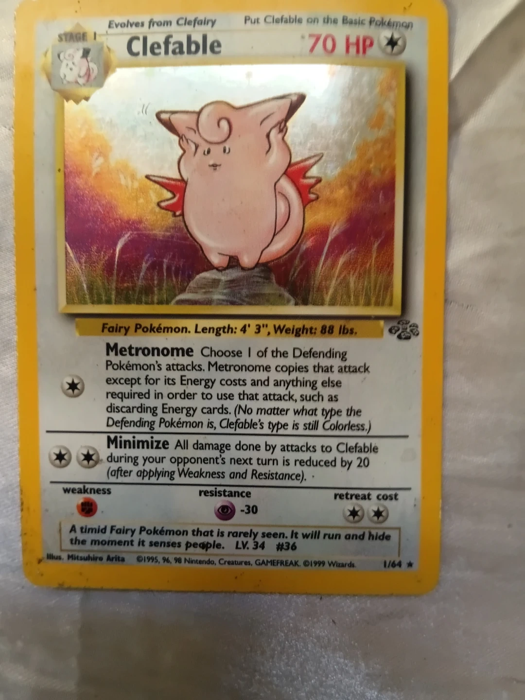 Buy & SellClefable Pokemon CardClefable Pokemon Card$5This is a Clefable Pokemon card. It is Stage 1 and has 70 HP. The card features the Fairy Pokémon and states its length as 4' 3" and weight as 88 lbs.ConditionLike newWHERE TO MEETKFCView MapSELLERverifiedGregSunset690 reviews4 chats·0 favorites·42 viewsSEND CHAT TO SELLERHi Greg! I’m interested in your listing.Hi Greg! I’m interested in your listing.Get the Karrot app to chatSign In to chat