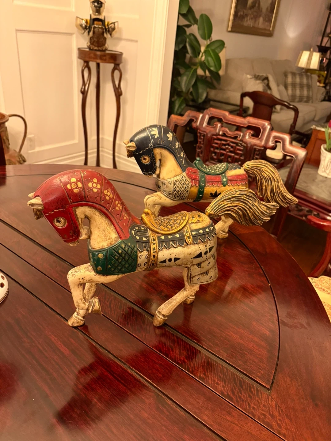 Two decorative wooden horses, hand-painted with intricate details. One horse is primarily red with gold accents, while the other features a blue saddle and bridle. They're designed to sit on a surface and add a unique touch to any room.