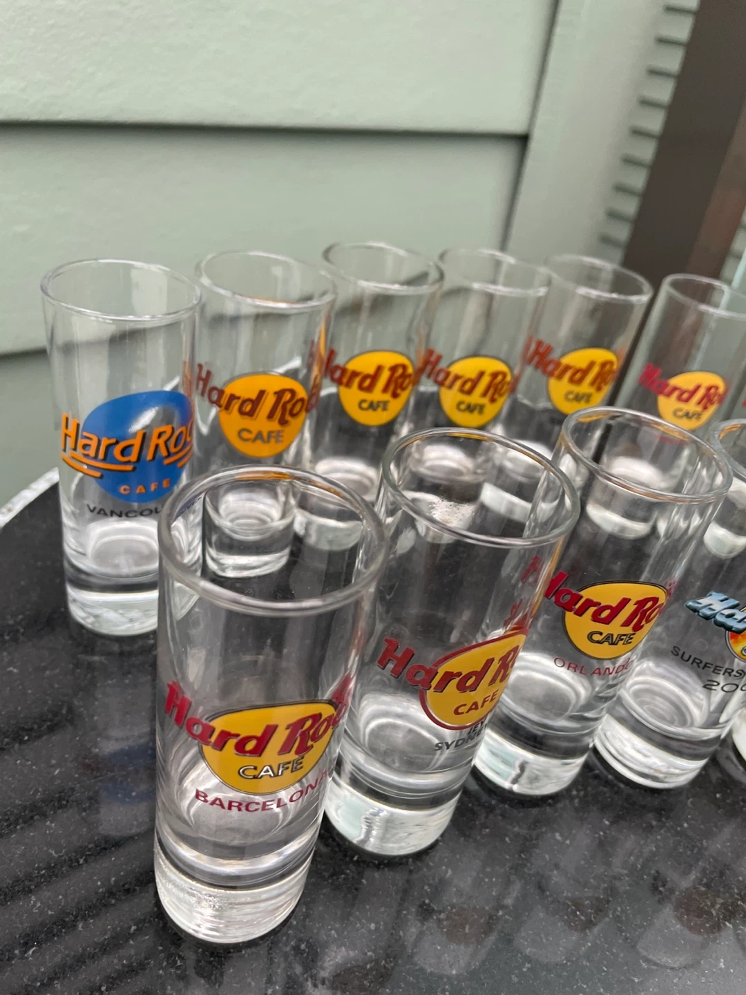 Selling a collection of Hard Rock Cafe shot glasses! They feature different city locations. A great addition for any collector or fan of the Hard Rock Cafe. Price is for them all. Great condition