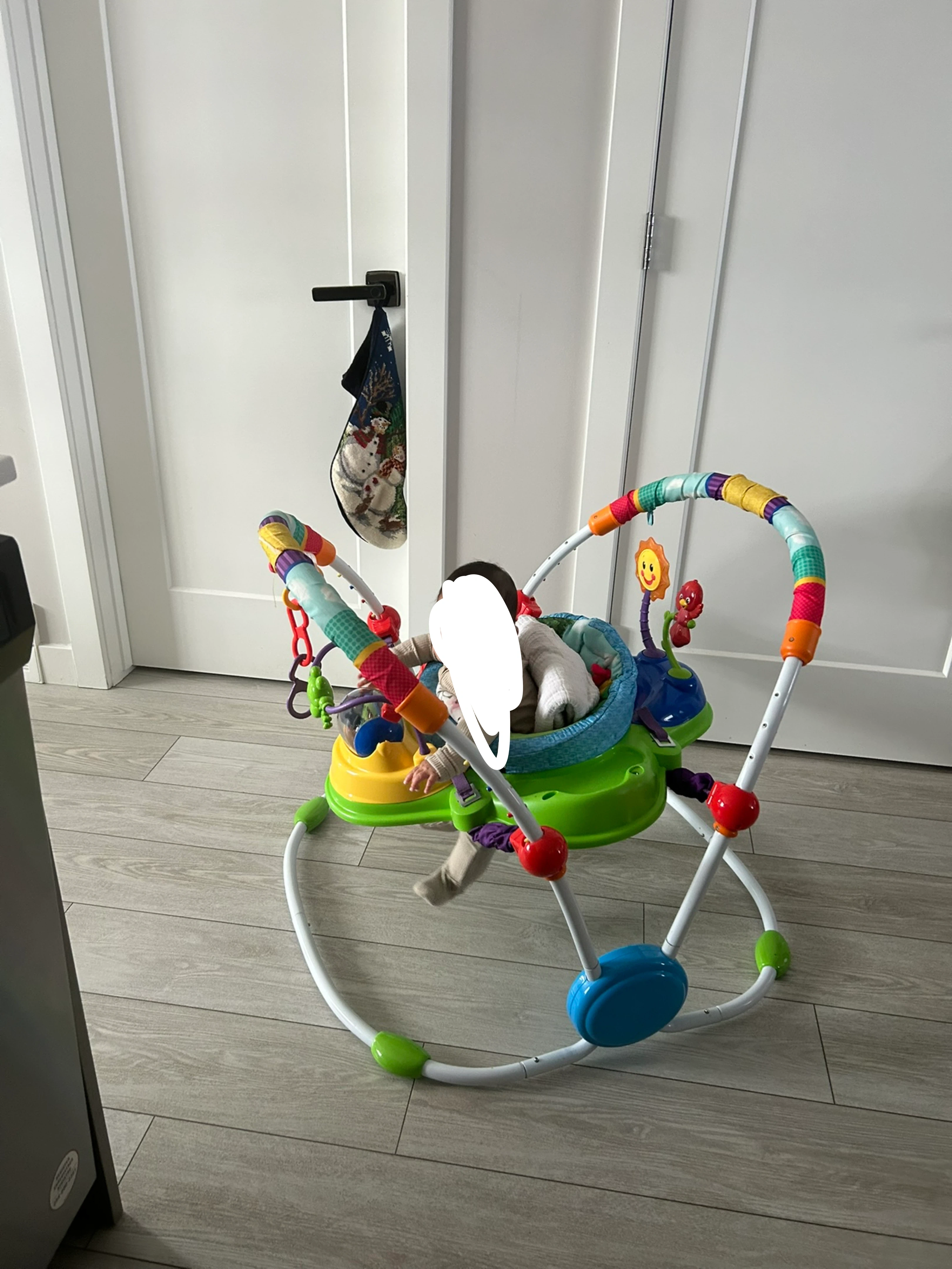 This interactive baby jumper provides entertainment and exercise for little ones. It features various toys and a musical component to stimulate development. Designed for babies who can hold their head up unassisted.