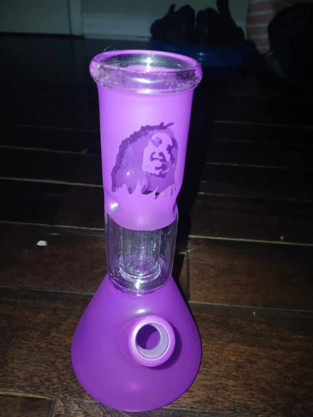 This purple water pipe features a Bob Marley decal. It's made of glass and has a beaker base with a percolator. Great for filtration! Brand new never used.