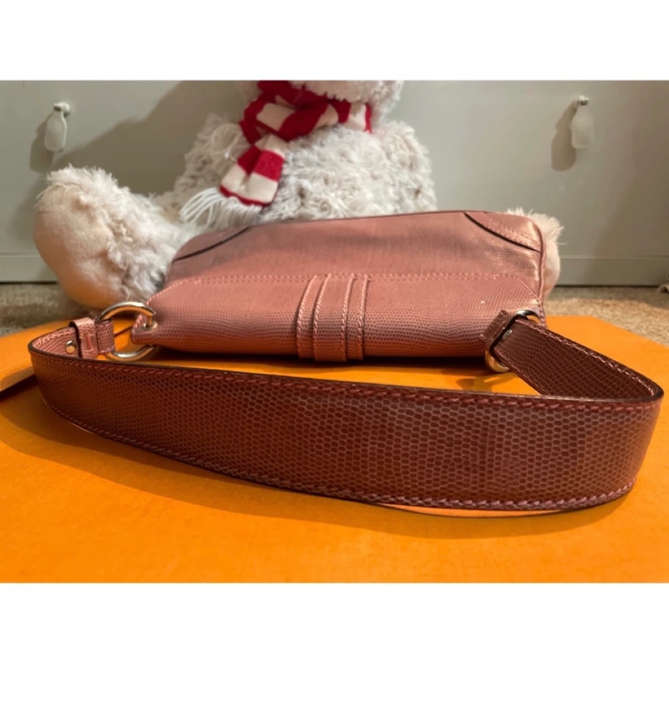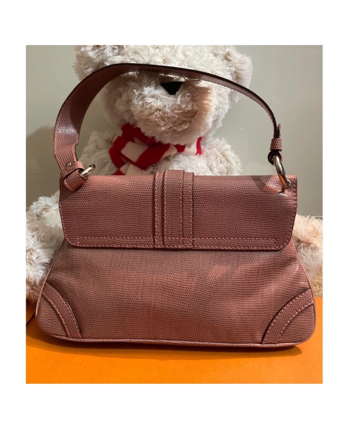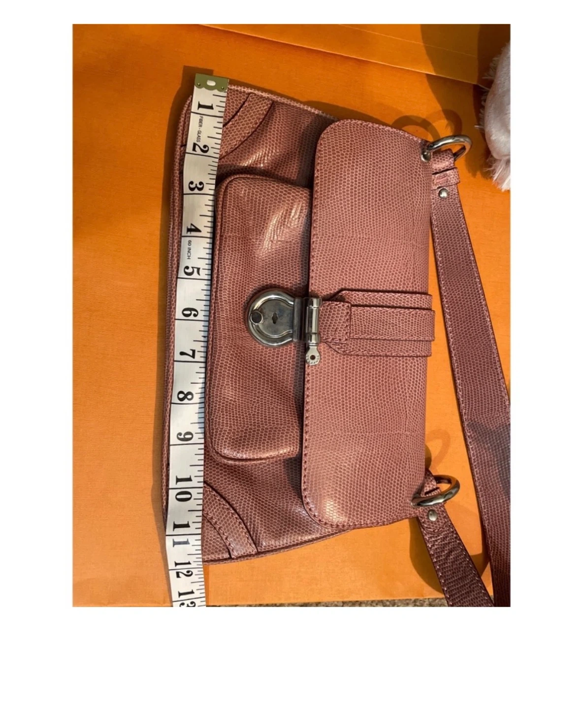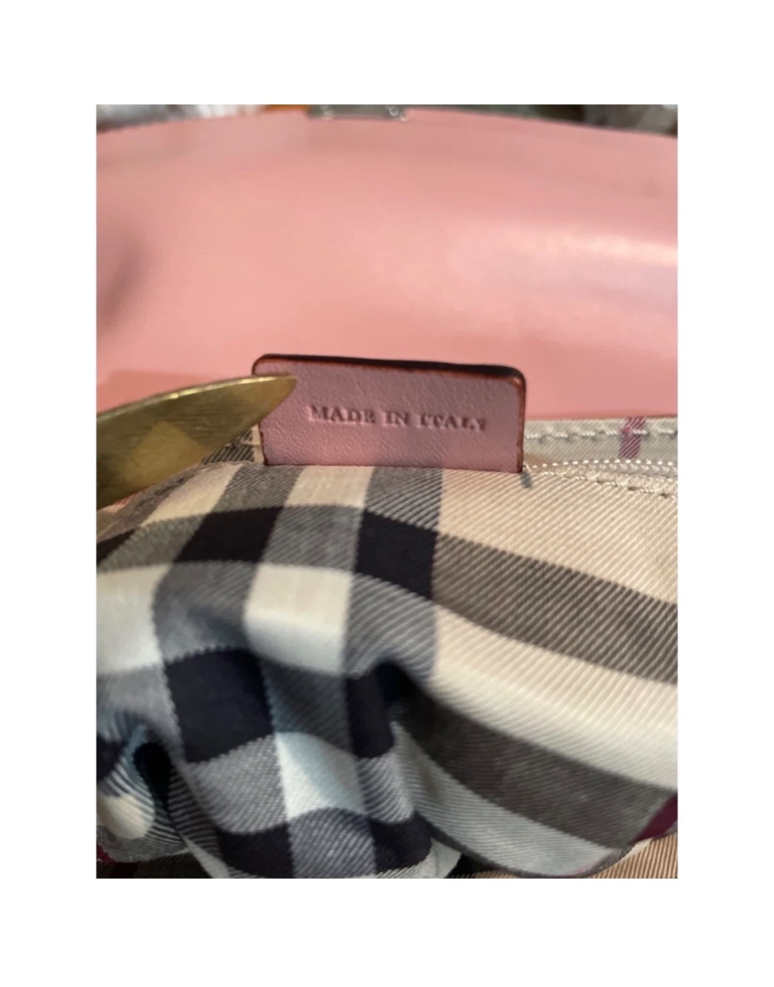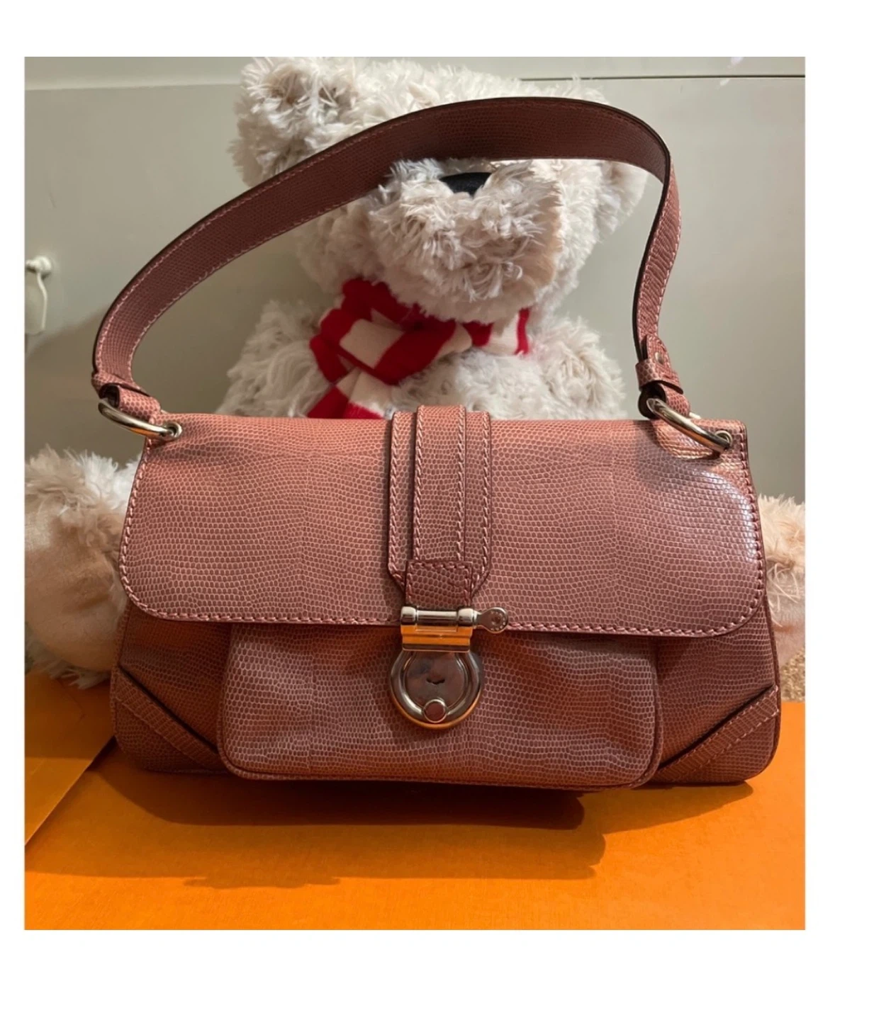 A classic Burberry London shoulder bag in a lovely pinkish-mauve colour. It's made with a textured material that mimics lizard skin. The interior features the iconic Nova Check pattern and a zippered compartment for essentials. It's a stylish and practical accessory! No box no dustbag