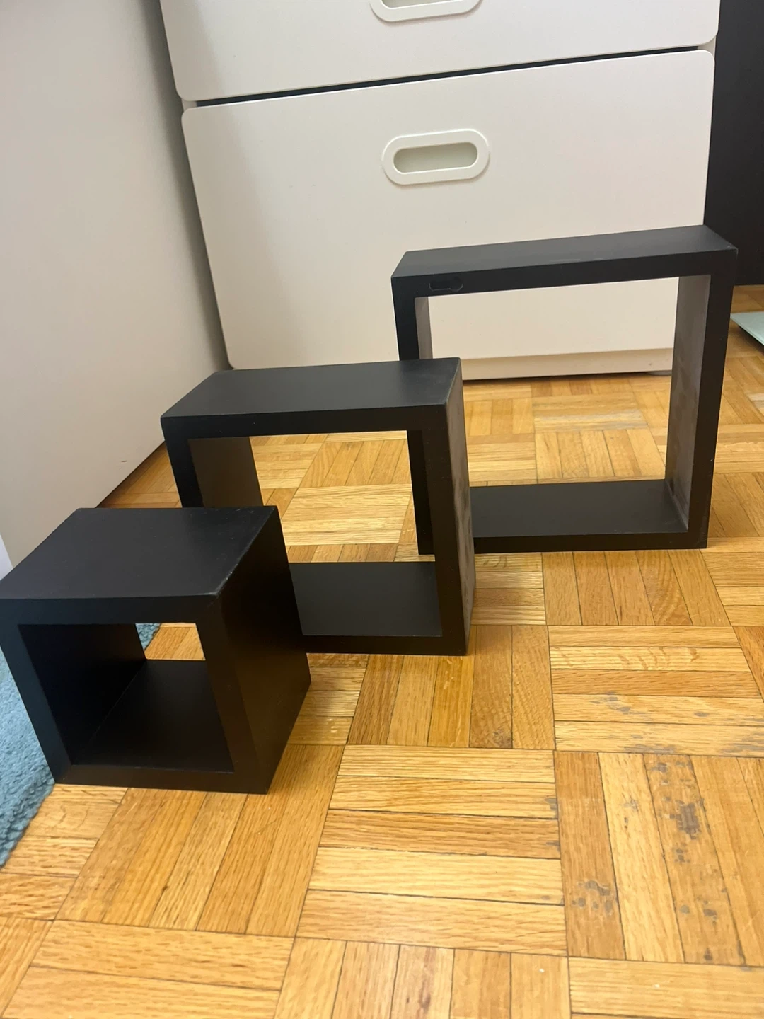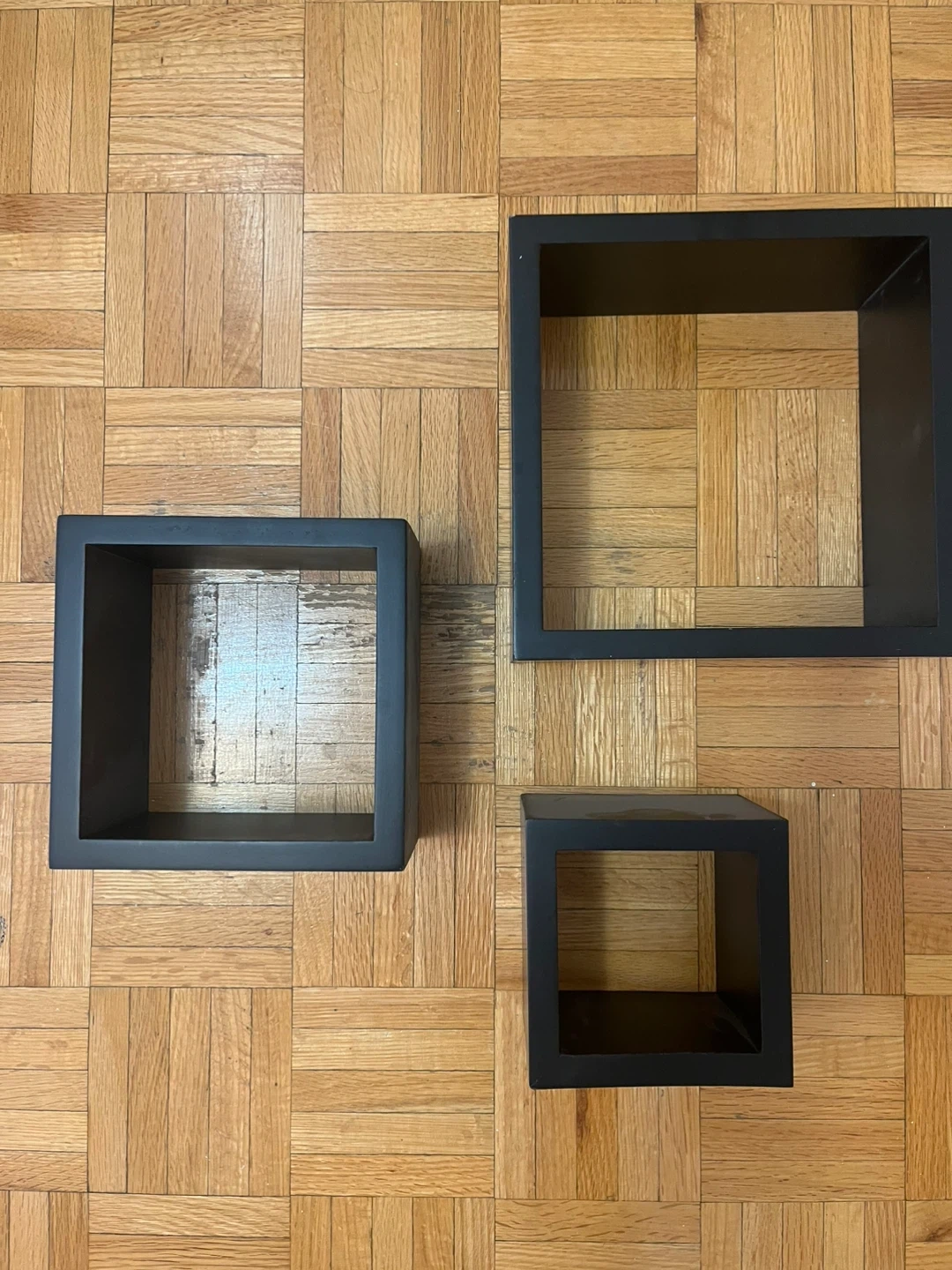 This set includes three black cube shelves in varying sizes. They're made of a sturdy wood composite material. Perfect for displaying items on walls. Connect to wall by screws.