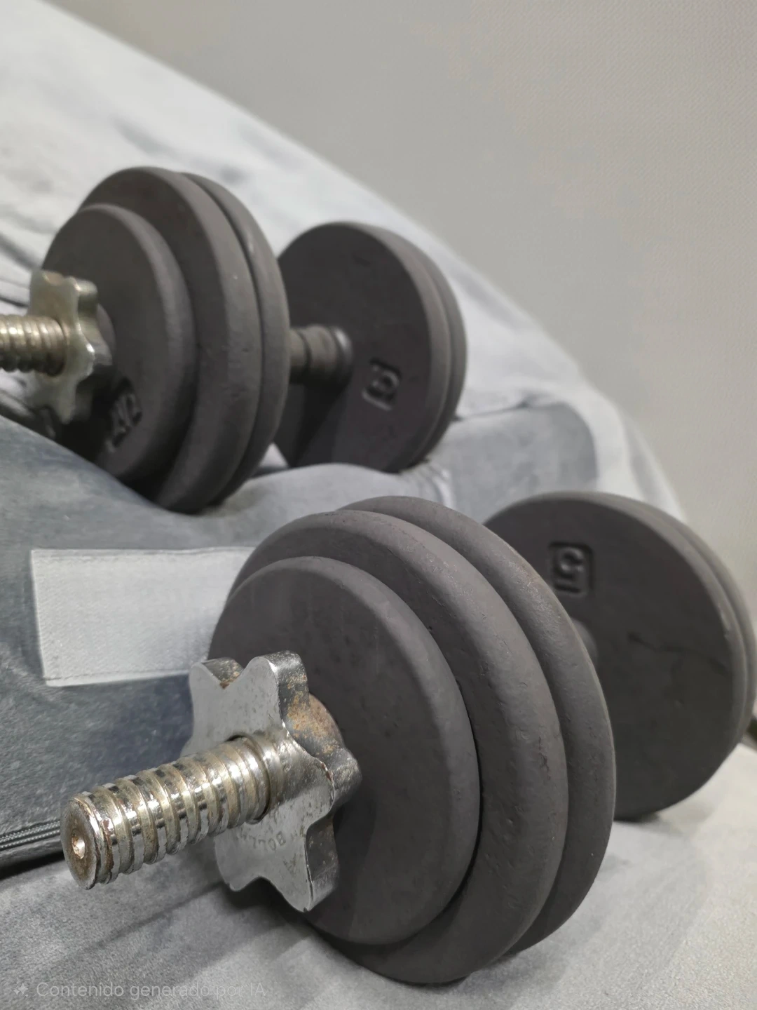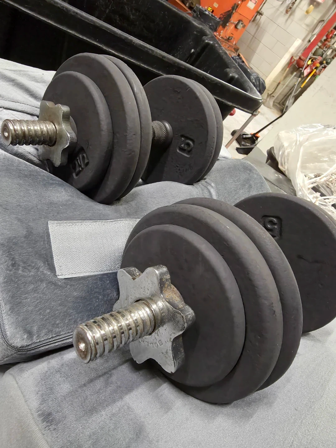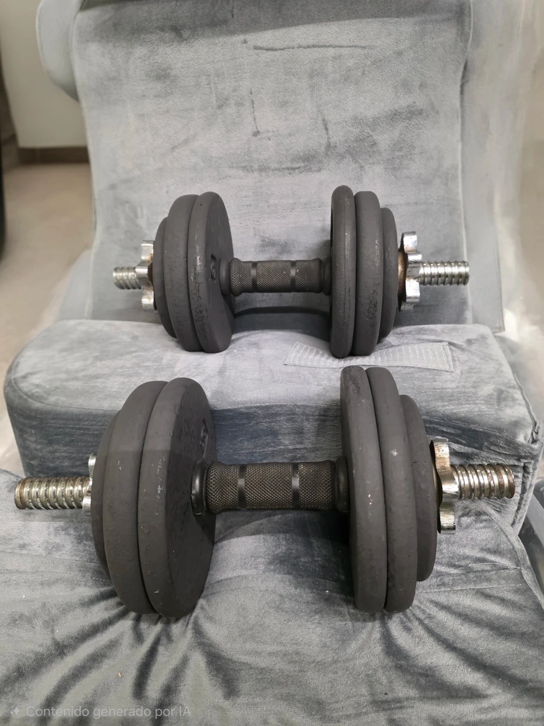 These are a pair of adjustable dumbbells. Each dumbbell (30 pounds) features a textured grip handle and screw-on collars to secure the weight plates. The weight plates are cast iron and coated in black rubber. Great for home workouts!