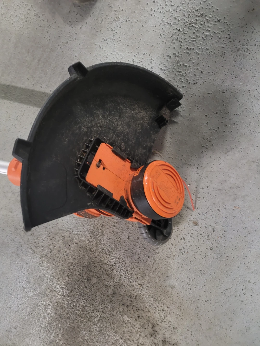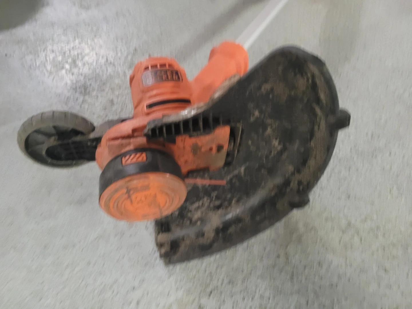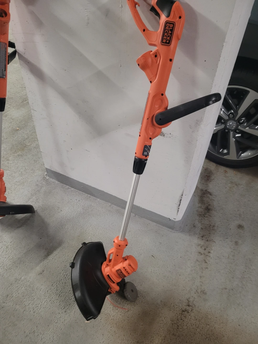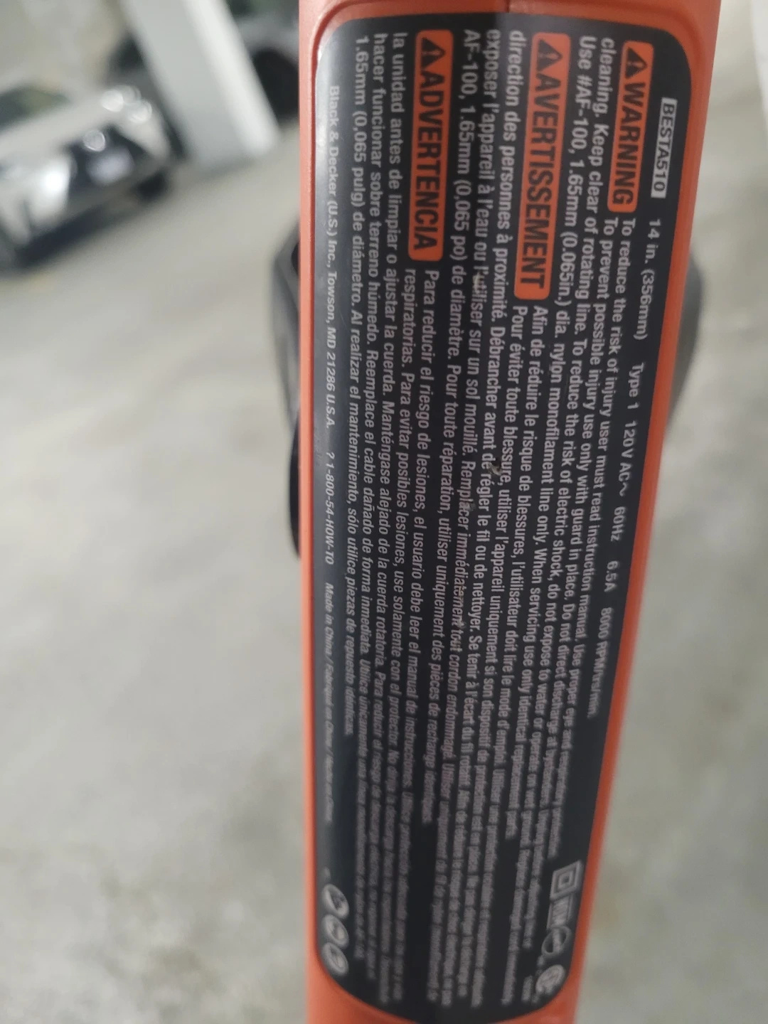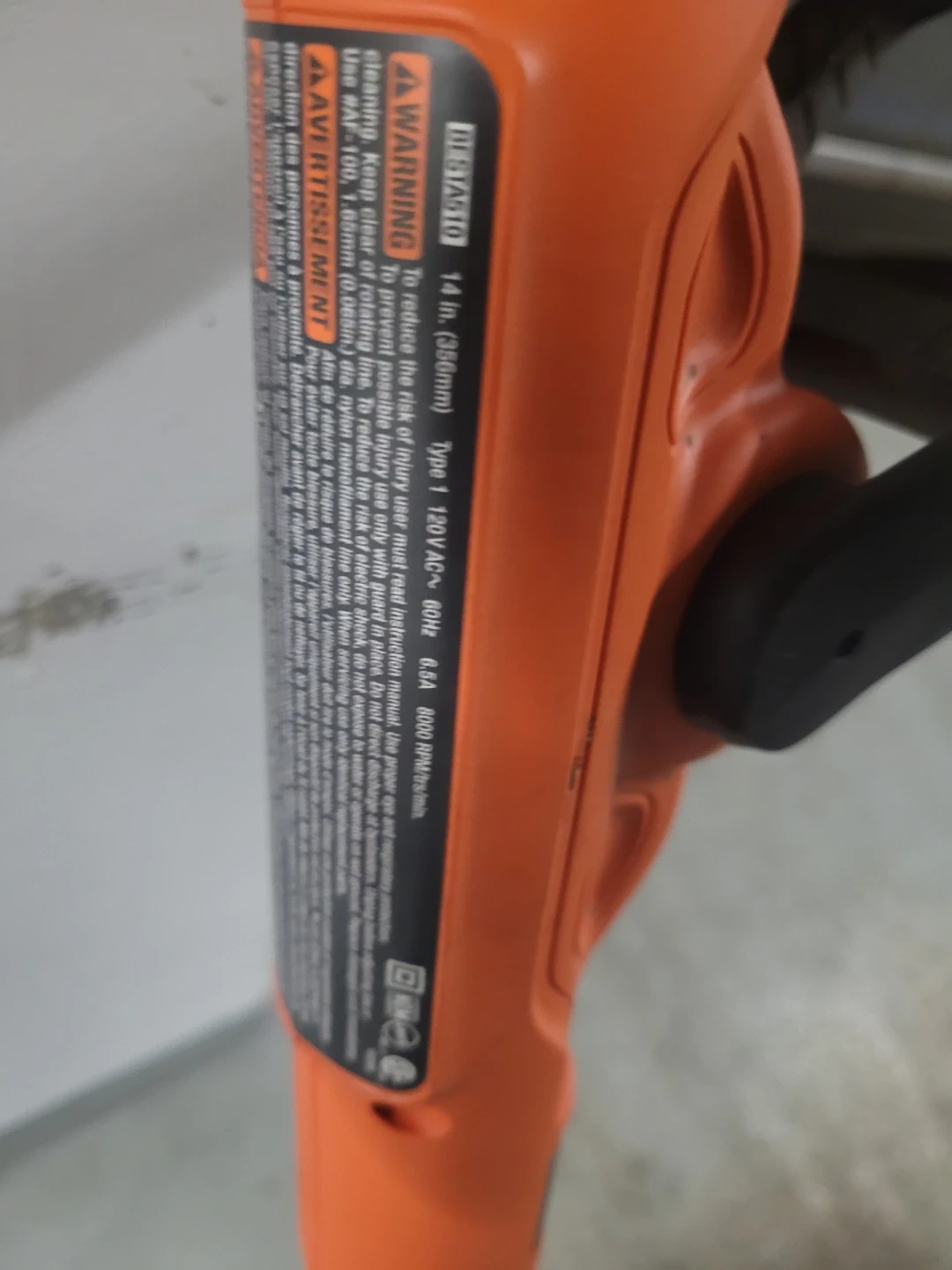 This is a Black+Decker electric string trimmer. It's orange and black in colour. It's a corded electric model that runs on 120V AC at 60Hz.Please see all pictures for details.