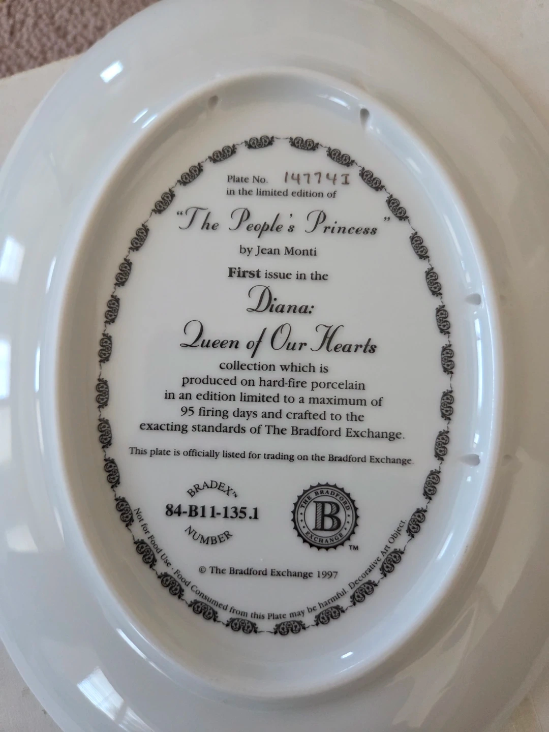 This decorative plate is the first issue in the 'Diana: Queen of Our Hearts' collection, limited to 95 firing days. It features artwork by Jean Monti and is crafted to exacting standards. A limited edition collectible from The Bradford Exchange.