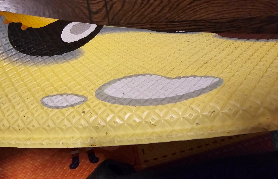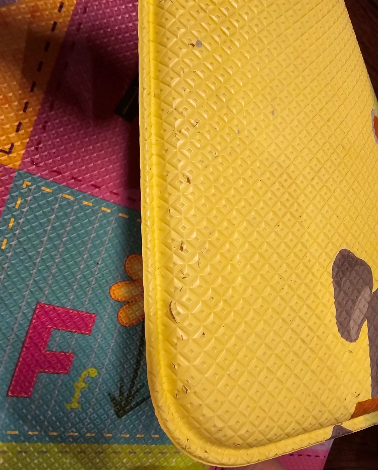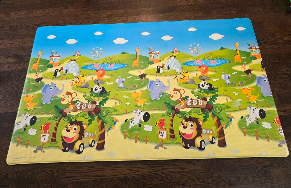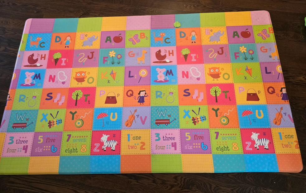 Reversible play mat. Very clean. The letter side is in excellent condition. There's some wear on the animal side. These mats adhere to the highest safety standards and extremely safe for falls.