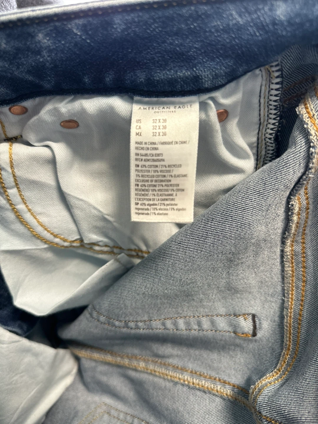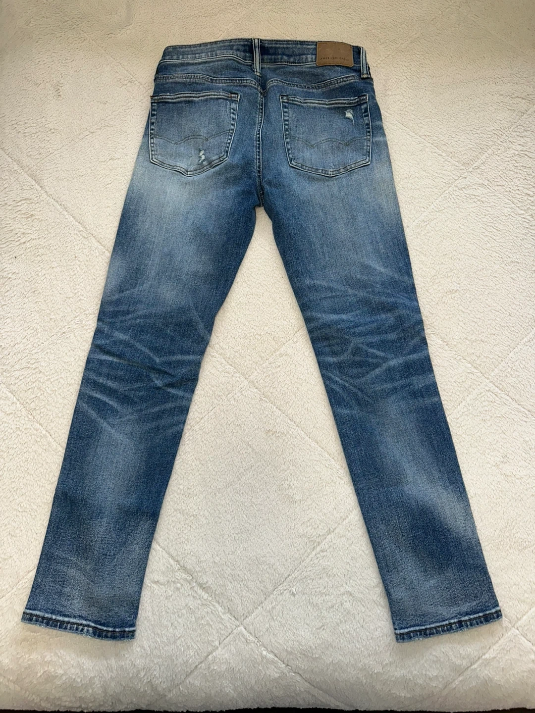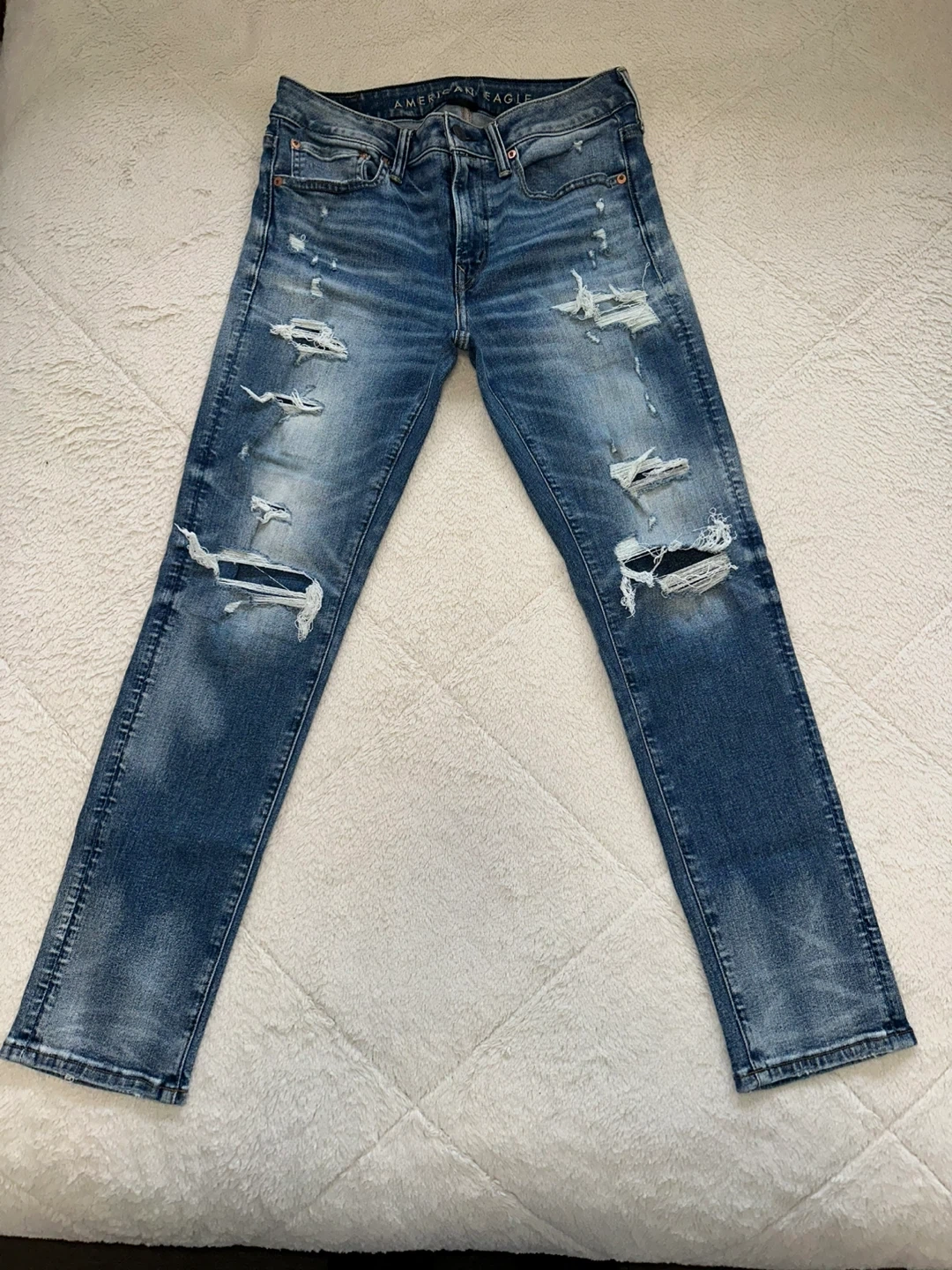 These are American Eagle Outfitters slim fit jeans in a blue wash with distressed detailing. They're a size 32x30 and made from a cotton blend with a bit of stretch. Good for casual wear!
