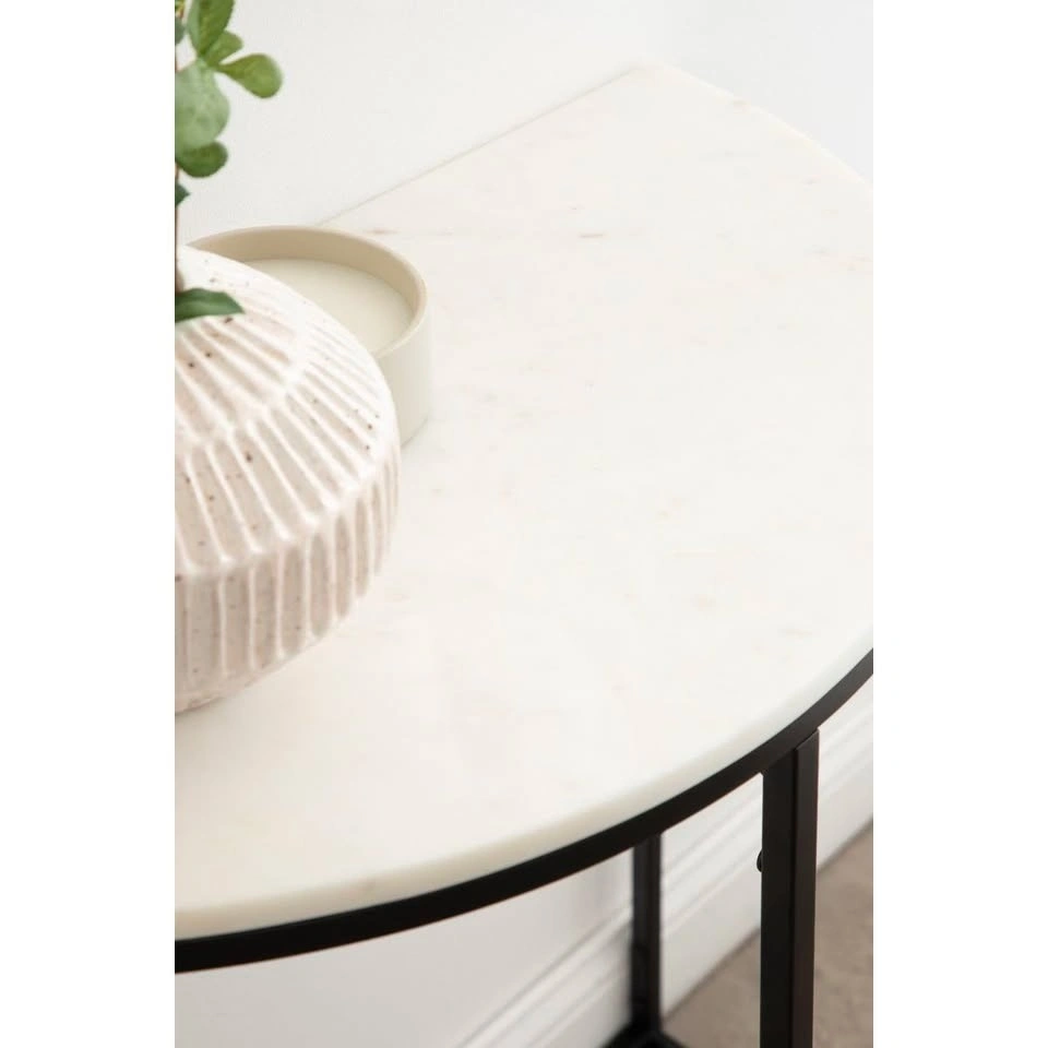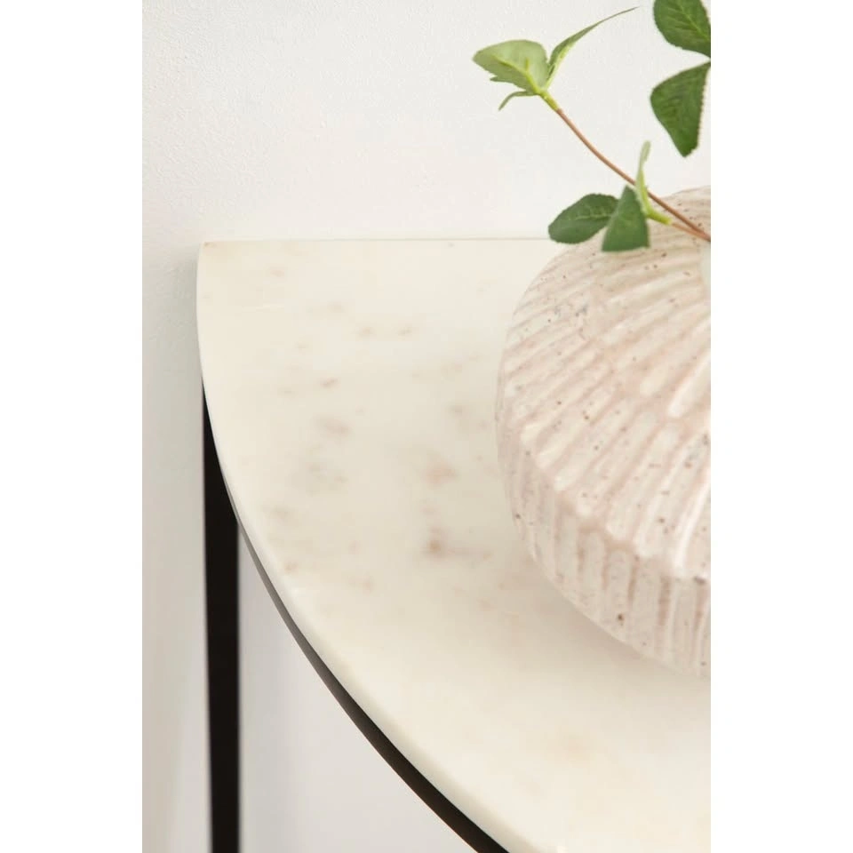 Price: $120, brand new in box. Half-circle console table with a sturdy metal base and durable marble tabletop, designed to fit neatly against a wall and ideal for entryways or small spaces like hallways.