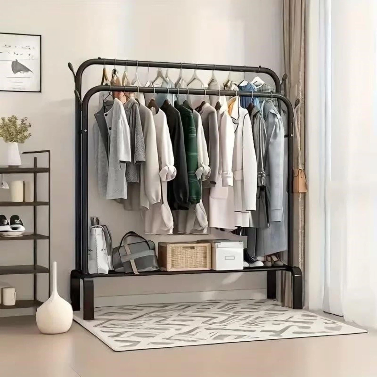 Sturdy black metal garment rack with two hanging rods and bottom shelves. Dimensions: 150cm height, 39cm depth. This rack offers ample space for clothes and shoes. It's great for organizing closets or extra storage!