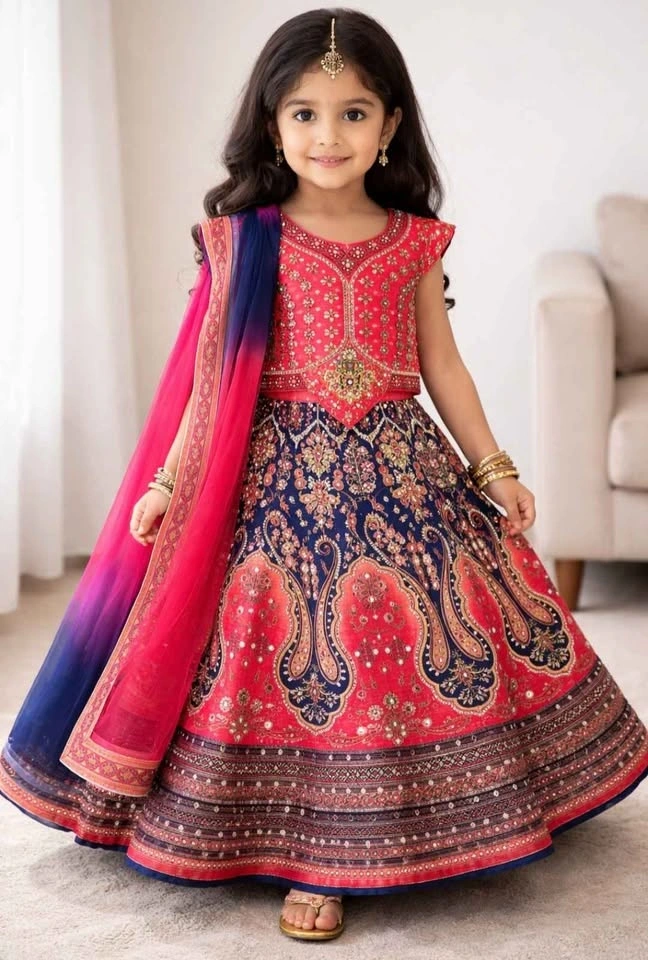 Coral Navy Mirror Work Embroidered Lengha Choli Set, Kids 5-8